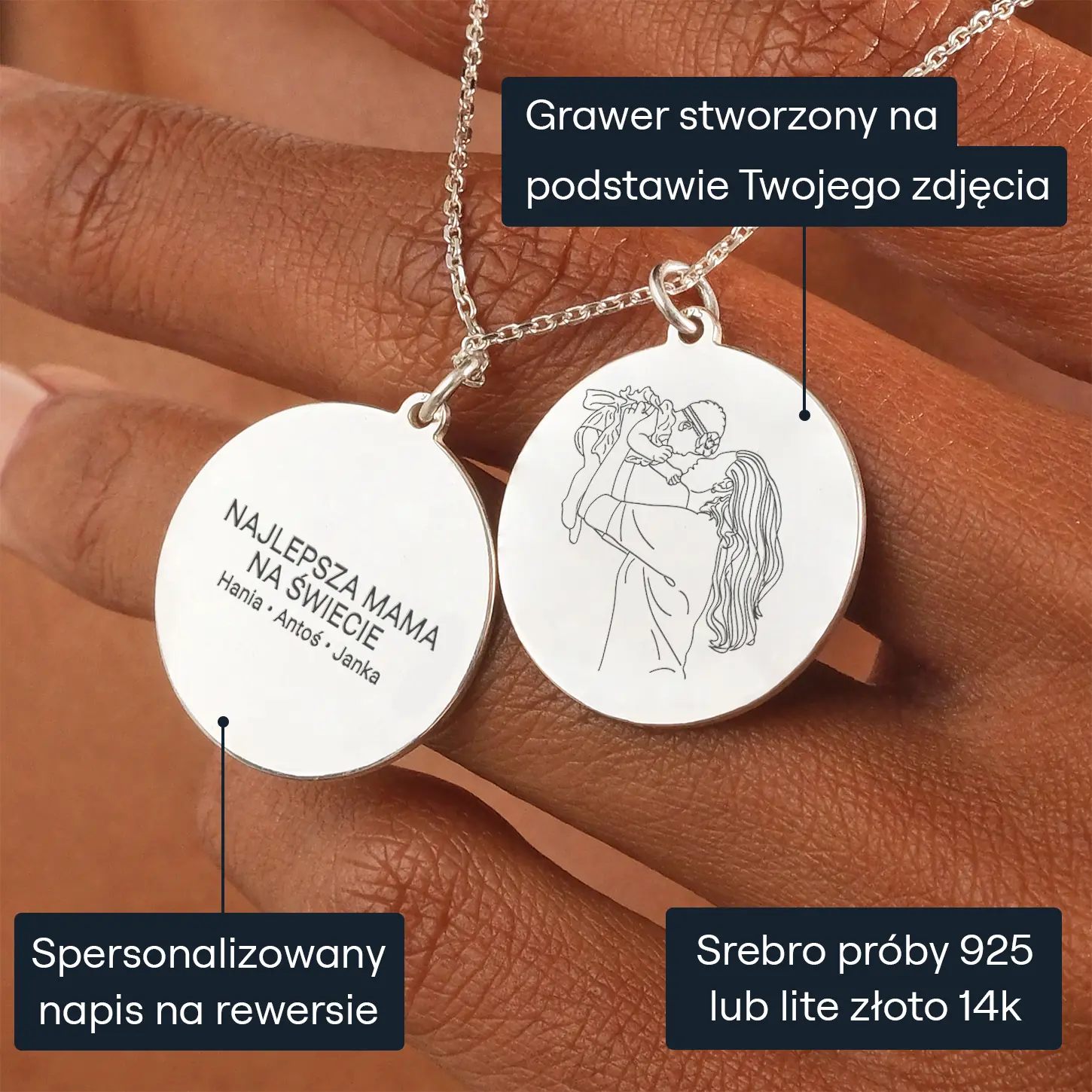 Personalizowana biżuteria jest dostarczana w eleganckim pudełku, wraz z instrukcjami pielęgnacji i specjalną ściereczką do czyszczenia, uosabiając nasze zaangażowanie w dostarczanie nie tylko biżuterii, ale także cennego doświadczenia. Prześlij zdjęcie swojej Mamy, aby stworzyć unikalną grafikę z przodu wisiorka - piękną pamiątkę wyjątkowej chwili. Z tyłu można wygrawerować wzruszającą wiadomość, nadającą głębszego znaczenia.