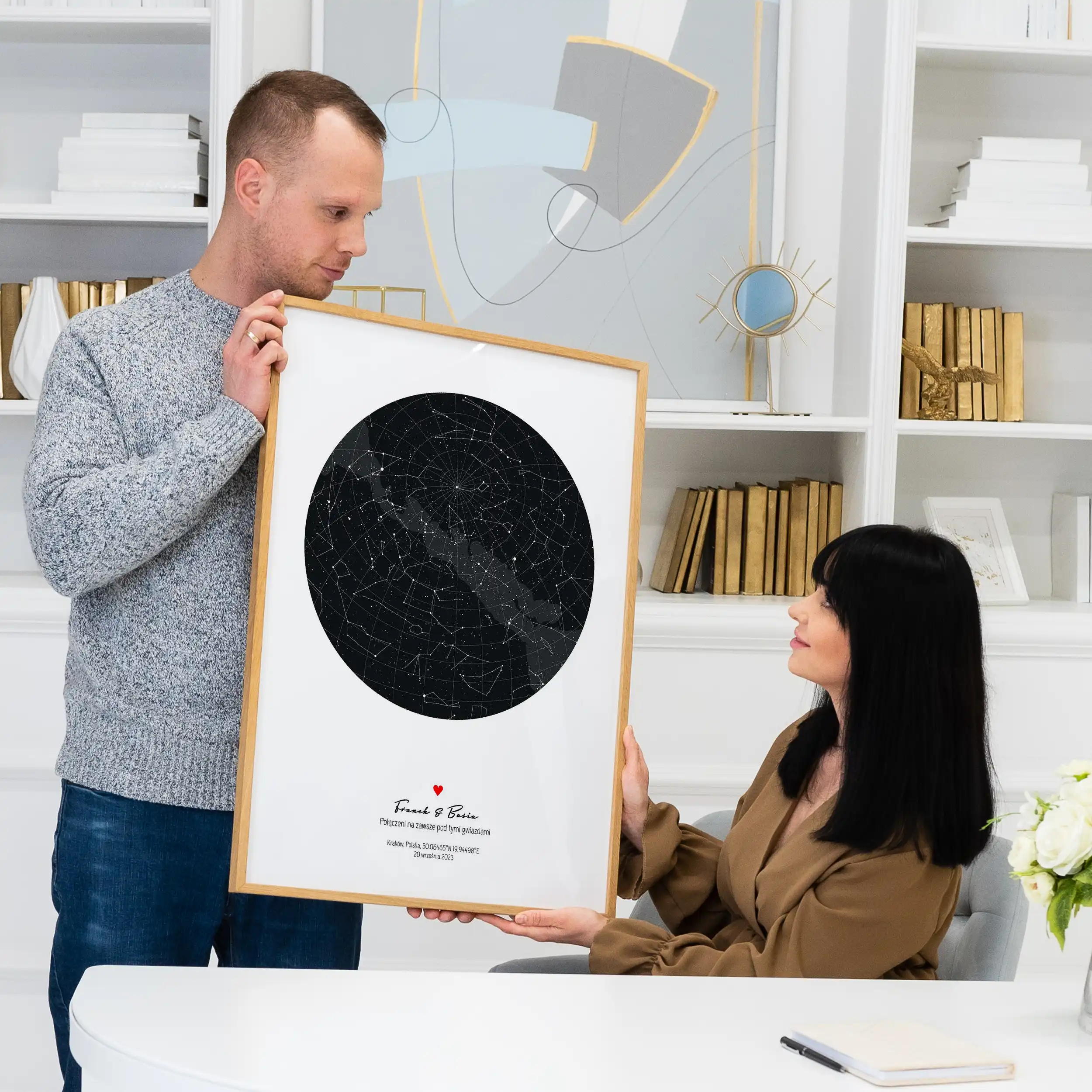 Bez względu na to, gdzie jesteś, nocne niebo ponad Tobą świeci milionem gwiazd. Widok ten różni się jednak, w zależności od czasu i miejsca, w którym przebywasz. Stwórz wyjątkowy prezent ślubny w postaci mapy nieba dla wybranej daty.