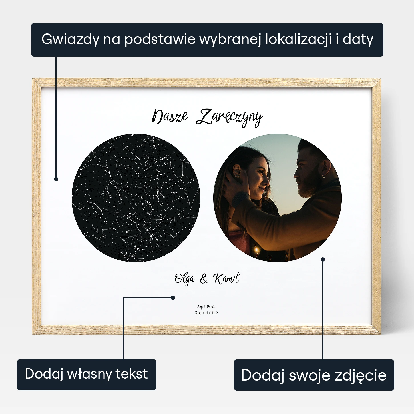 Świętuj cudowną miłosną podróż z "Mapą Nieba w Dniu Zaręczyn ze Zdjęciem". To wzruszające arcydzieło przedstawia gwiaździste niebo dokładnie w momencie zaręczyn. Niezależnie od tego, czy jest to prezent dla przyjaciół, czy Twojego partnera, jest to idealny sposób na upamiętnienie początku wieczności. Połącz mapę gwiazd z tej wyjątkowej nocy ze swoim ulubionym zdjęciem, tworząc cenną pamiątkę.