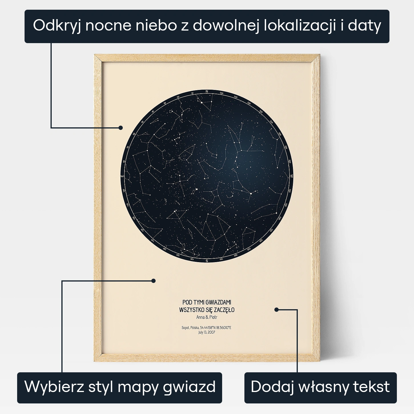Mapa Gwiazd to spersonalizowany plakat przedstawiający nocne niebo z konkretnej daty i miejsca. Konkretnie, używa precyzyjnych danych z satelity Hipparcos do odwzorowania układu gwiazd. W konsekwencji, upamiętnia wyjątkowe chwile w formie pięknej pamiątki na lata.