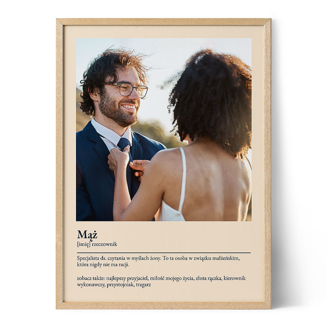 Uczcij wyjątkowego mężczyznę naszym produktem Mąż Plakat z Definicją. Ten personalizowany wydruk zawiera Twoje własne zdjęcie i słownikową definicję "męża" lub "pana młodego". Wszystko zależy od Ciebie, czy wybierzesz zabawną, czy emocjonalną definicję. Przejdź do naszego łatwego kreatora online, aby rozpocząć projekt. Wybierz odpowiednią kolorystykę lub dostosuj ją, wybierając własny kolor tła i czcionki. Następnie prześlij zdjęcie, wprowadź tytuł i dodaj definicję. Możesz użyć naszej gotowej definicji lub stworzyć swoją własną, niepowtarzalną.