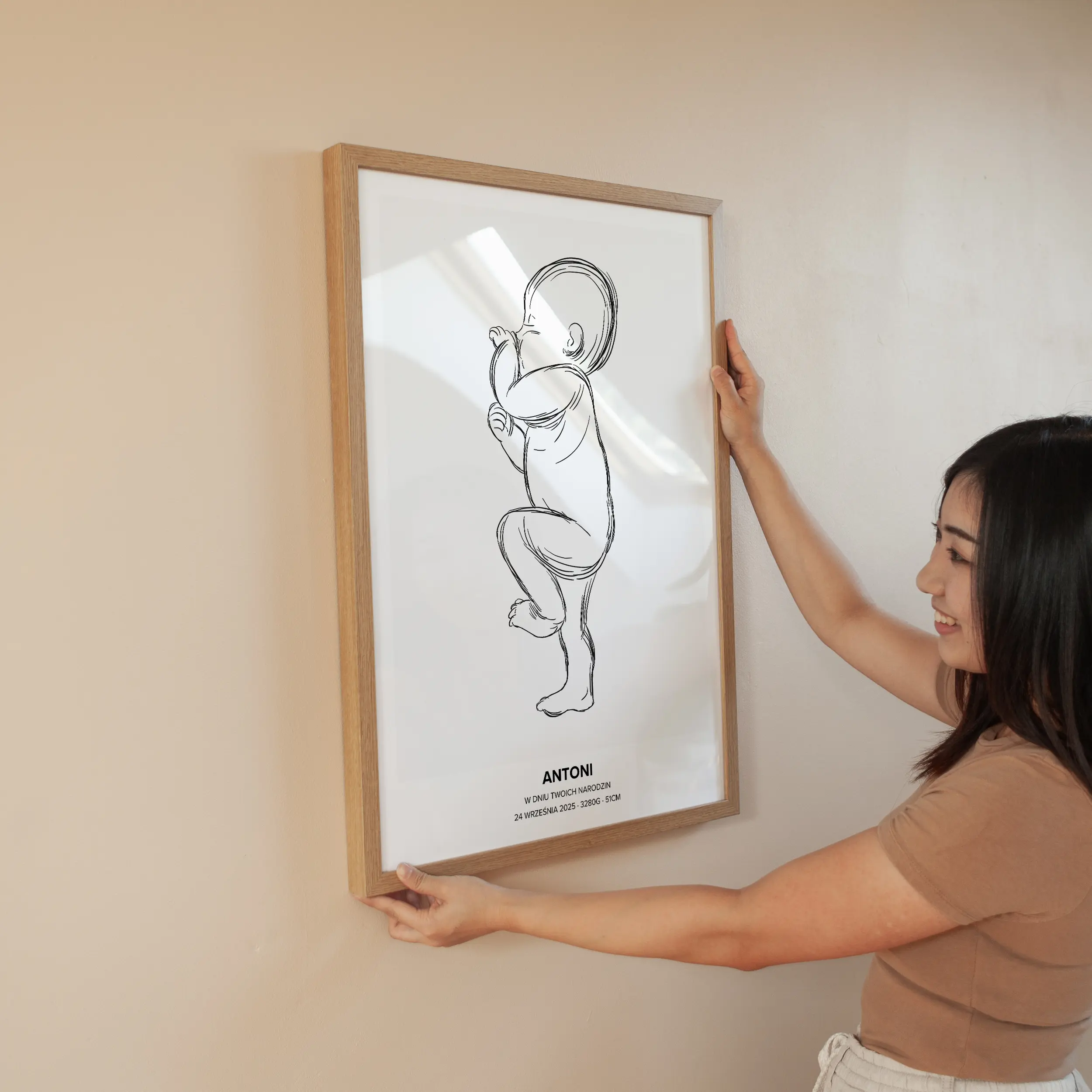 Dzieci rosną w ekspresowym tempie. Szczególnie niemowlaki. Nim się obejrzysz maluch wskoczy w większy rozmiar ubranek, a potem znów w kolejny. Metryczka dziecka w skali 1:1 przypomni o wielkości noworodka w pierwszym dniu jego życia. Grafika przedstawiająca dziecko na naszym plakacie będzie dokładnie takie wymiary, jakie wprowadzisz w kreatorze.