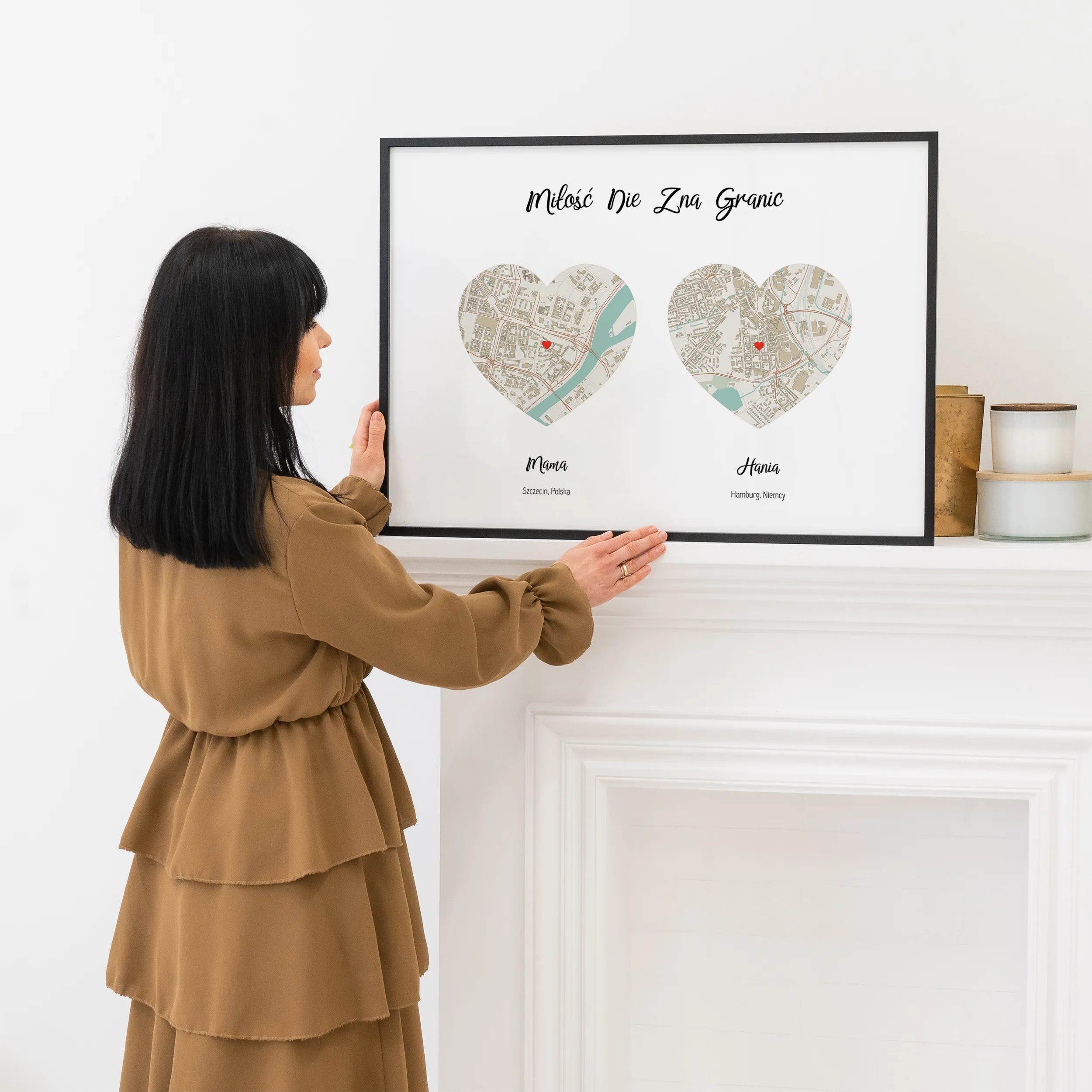 Nasza mapa „Miłość Nie Zna Granic” dla mamy przedstawia wyjątkową więź między tobą a twoją mamą. Aby stworzyć idealny prezent dla Mamy, po prostu wpisz dwa adresy, którymi oznaczymy Twoje lokalizacje na pięknej mapie. Możesz także dostosować mapę, wybierając kolor, styl i rozmiar. Zadbamy o to, żeby był to prezent, który Twoja mama z dumą będzie prezentowała w swoim domu.