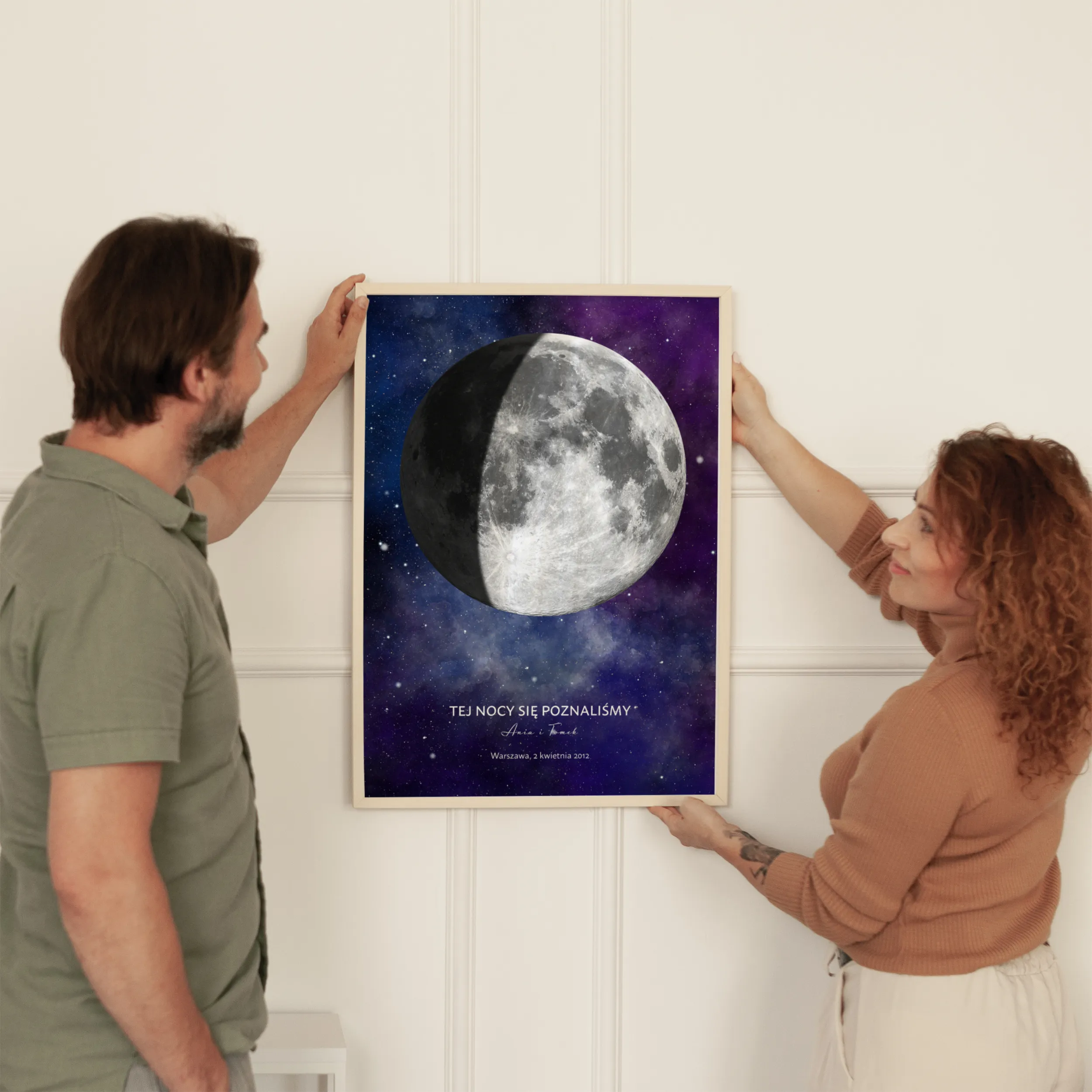 Personalizowany plakat Nasz Księżyc odtwarza fazę księżyca dla wybranej daty i lokalizacji. To do Ciebie należy wybór: data i miejsce pierwszego spotkania, pierwszego wyznania miłosnego, a może zaręczyn? Pomagamy Ci zatrzymać ten wspaniały moment w czasie w formie plakatu, który może zająć honorowe miejsce w Waszym wspólnym domu.