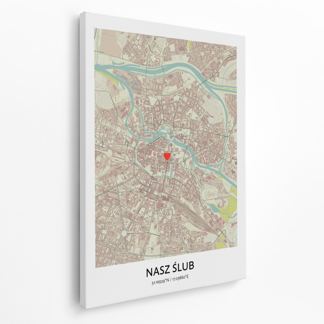 Szukasz wyjątkowego i wzruszającego prezentu dla nowożeńców? Nasz Obraz na Płótnie Nasz Ślub to idealny wybór. Podkreśl wyjątkowe miejsce, w którym para powiedziała sobie " TAK" za pomocą pięknej, personalizowanej mapy.