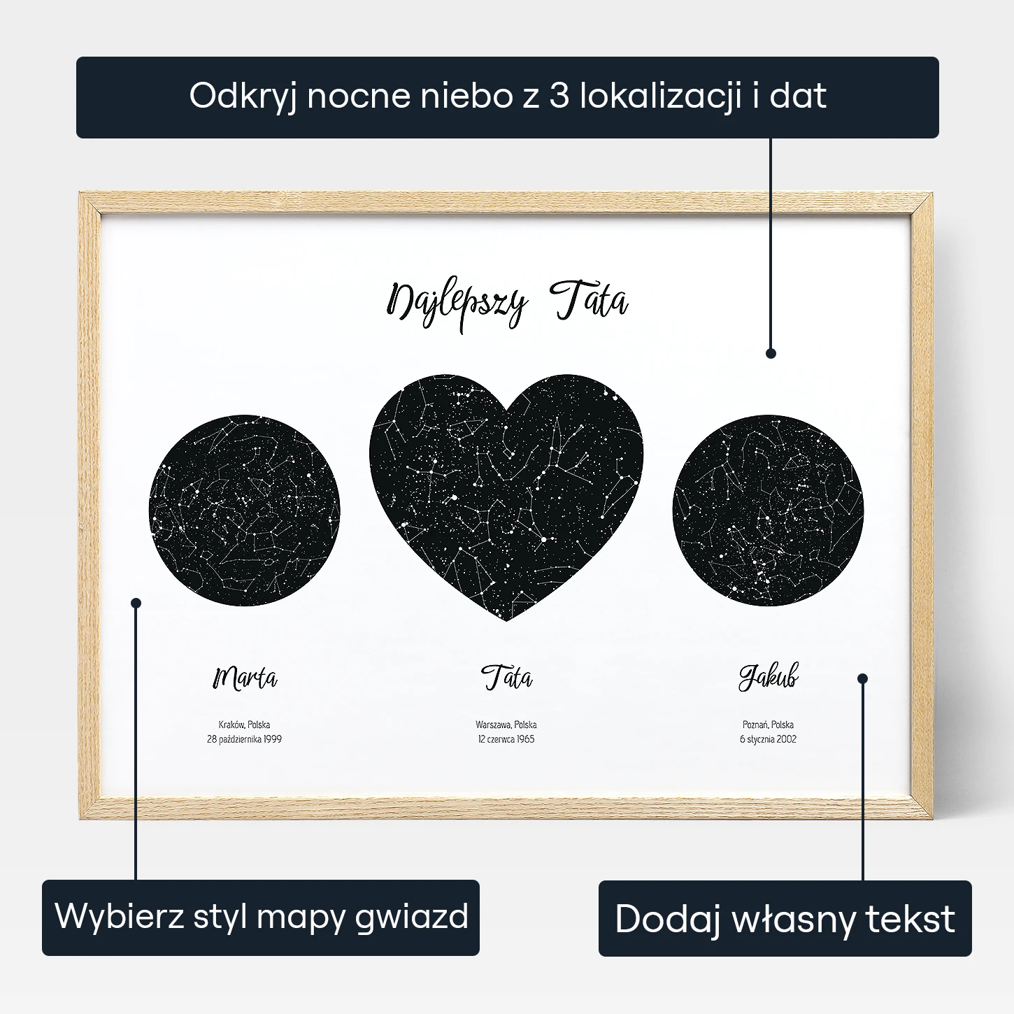 Ten plakat z trzema pięknymi mapami gwiazd można w pełni dostosować do własnych potrzeb. Na jednej z map widnieje data i miejsce urodzenia Twojego ojca, a dwie pozostałe mapy są dedykowane Tobie i Twojemu rodzeństwu.