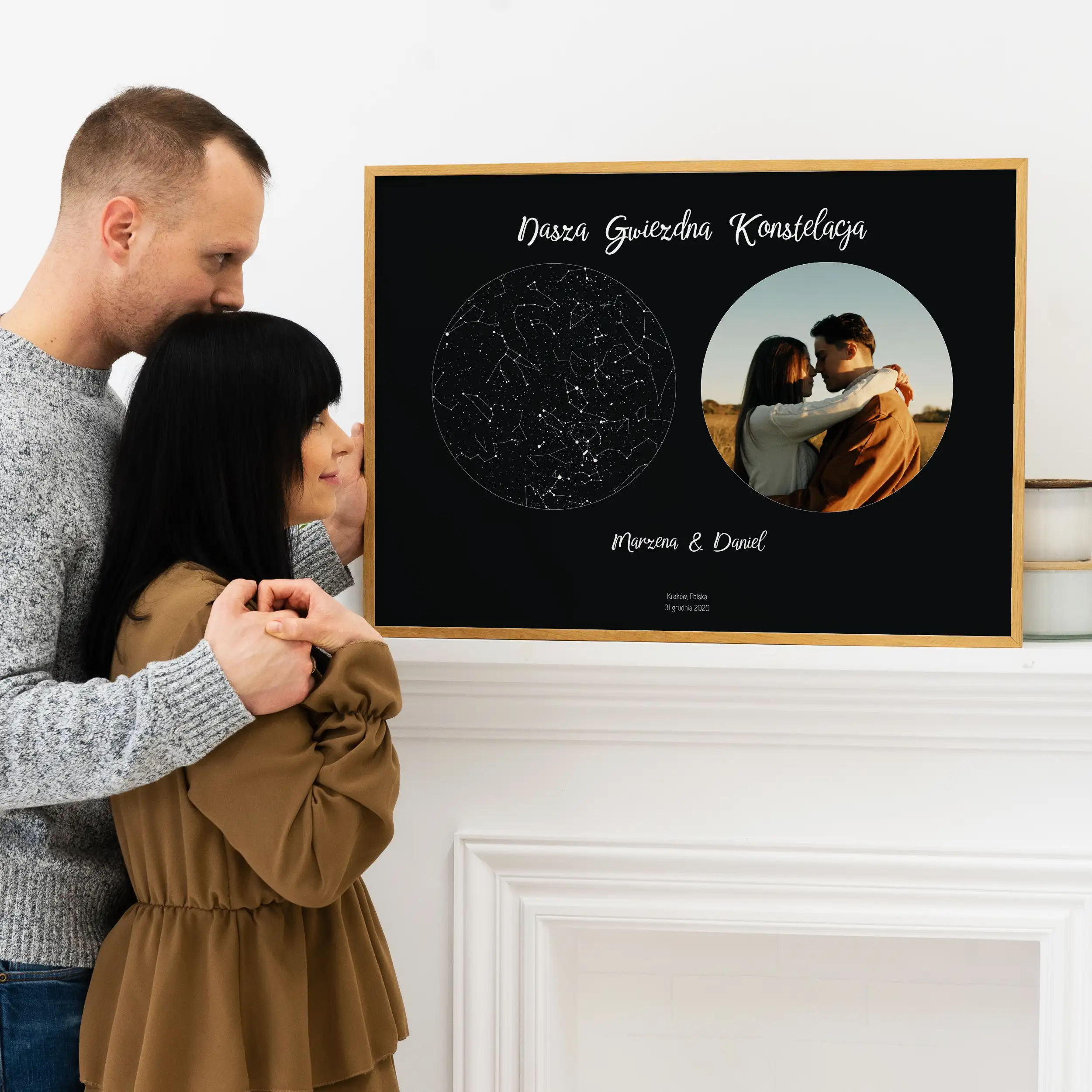"Nasza Gwiezdna Konstelacja ze Zdjęciem" to historia miłosna na wystawie. To świadectwo Waszej miłości i wspomnień, które zbliżyły Was do siebie. Każde spojrzenie na tę mapę gwiazd i zdjęcie przywołuje uczucia tej magicznej nocy, czyniąc ją trwałym wspomnieniem Waszej historii miłości. Spraw, aby Twój romantyczny prezent był niezapomniany dzięki temu personalizowanemu arcydziełu.