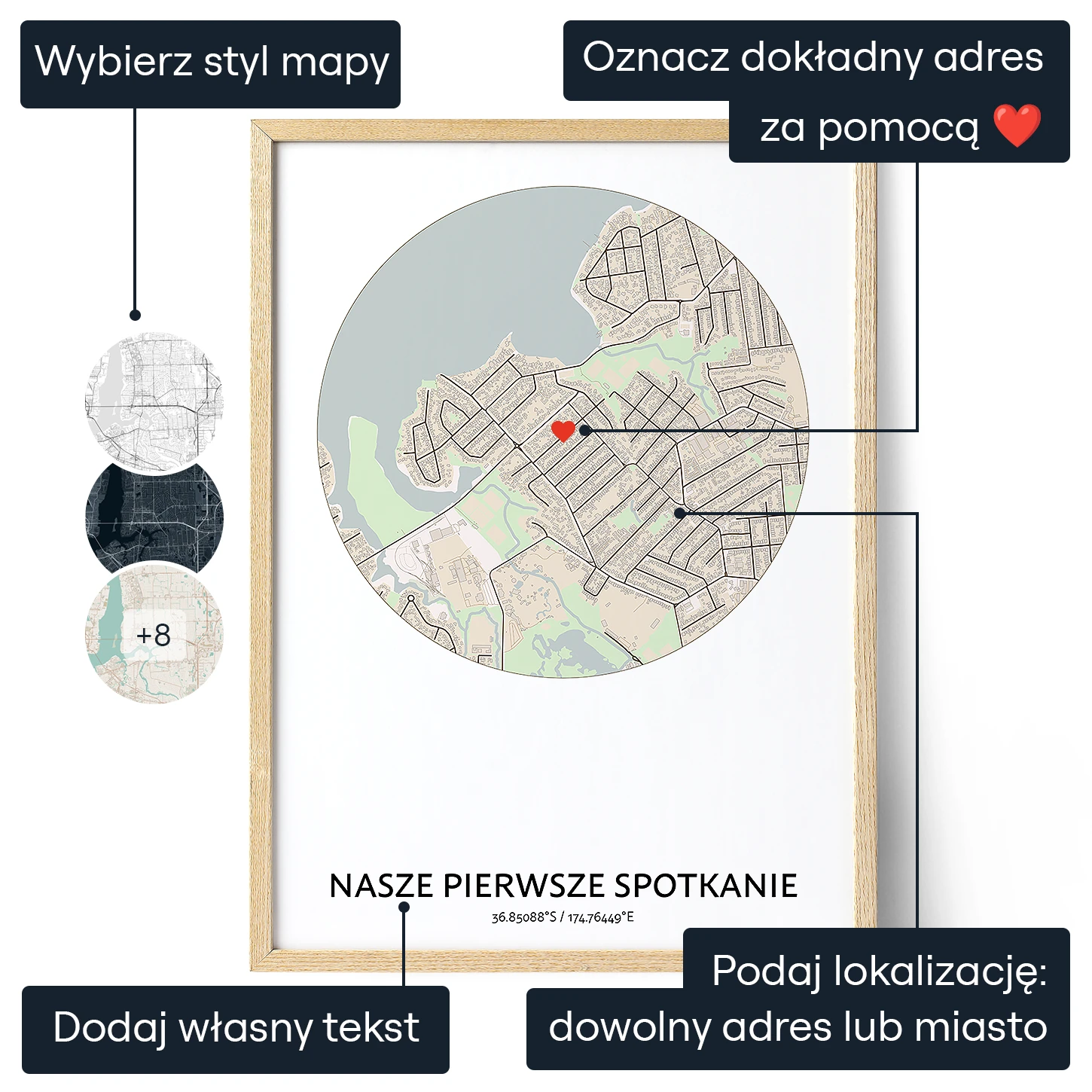 Nasze Pierwsze Spotkanie Okrągła Mapa to odmiana mapy "Nasze Pierwsze Spotkanie", która ma okrągły design. Ten spersonalizowany plakat jest idealny dla tych, którzy preferują bardziej nowoczesny i elegancki wygląd wystroju domu. Pokazuje miejsce, w którym dwoje ludzi spotkało się po raz pierwszy w wyjątkowy i przyciągający wzrok sposób, z okrągłym kształtem, który zwraca uwagę na specjalne miejsce.