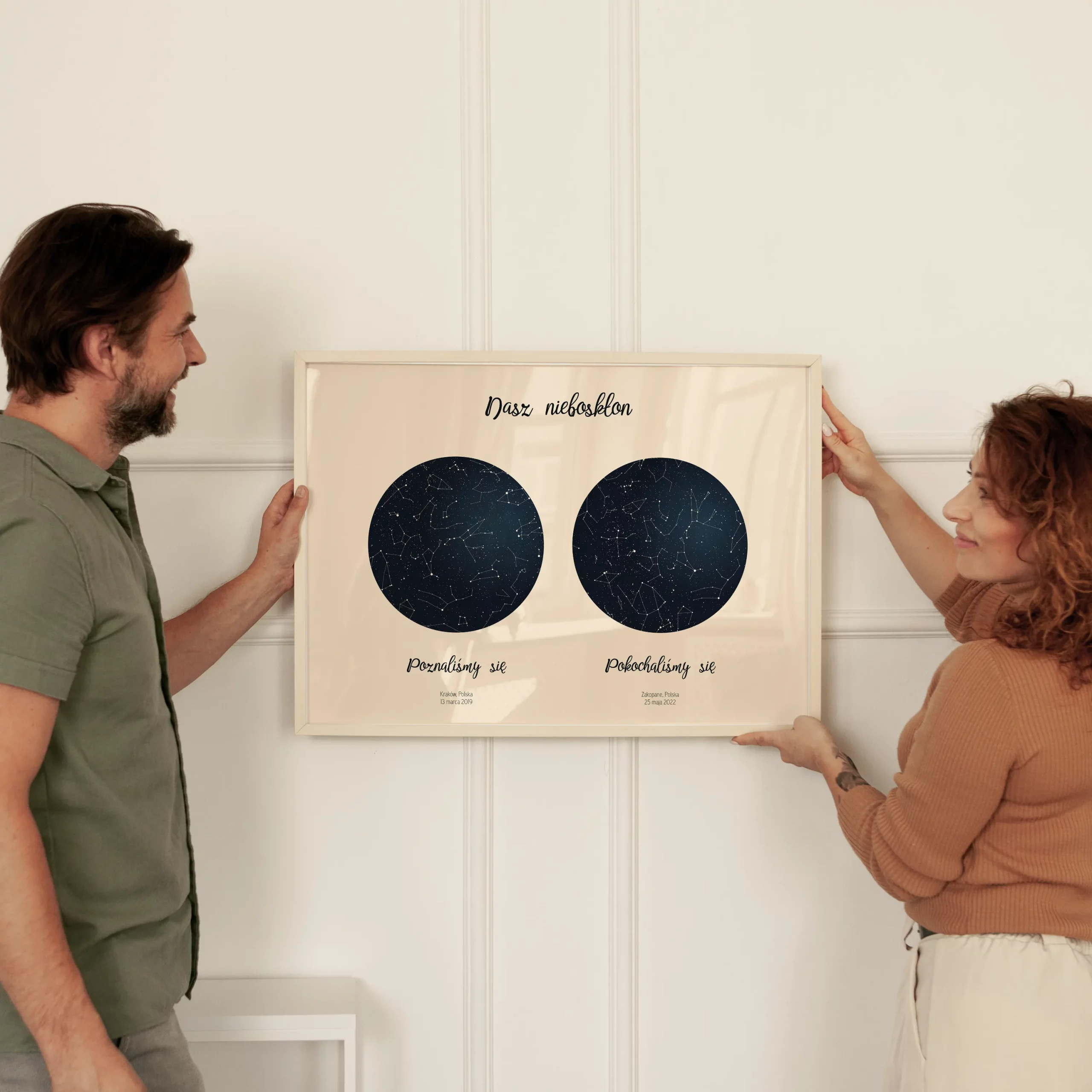 Zaprojektowanie Podwójnej Mapy Gwiazd to pestka! Dzięki naszemu łatwemu, 3-etapowemu procesowi możesz w mgnieniu oka otrzymać spersonalizowany wydruk.
