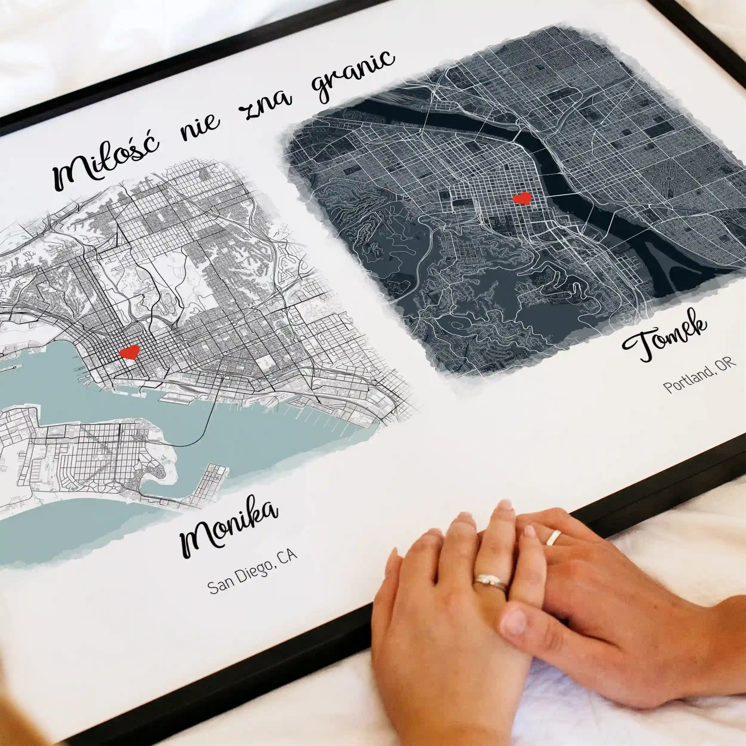 Jest coś wyjątkowego w możliwości zobaczenia na mapie ważnych dla Ciebie miejsc. Podwójna Mapa oferuje nietuzinkowy sposób, aby to zrobić - tworząc dwuczęściową mapę, która pokazuje dwa miejsca, które mają dla Ciebie specjalne znaczenie. Niezależnie od tego, czy jest to Twoja pierwsza i druga randka, pamiątki z Twoich ulubionych podróży, czy inne miejsca, które opowiadają Twoją historię, Podwójna Mapa pozwala uchwycić te wspomnienia w piękny i spersonalizowany sposób.