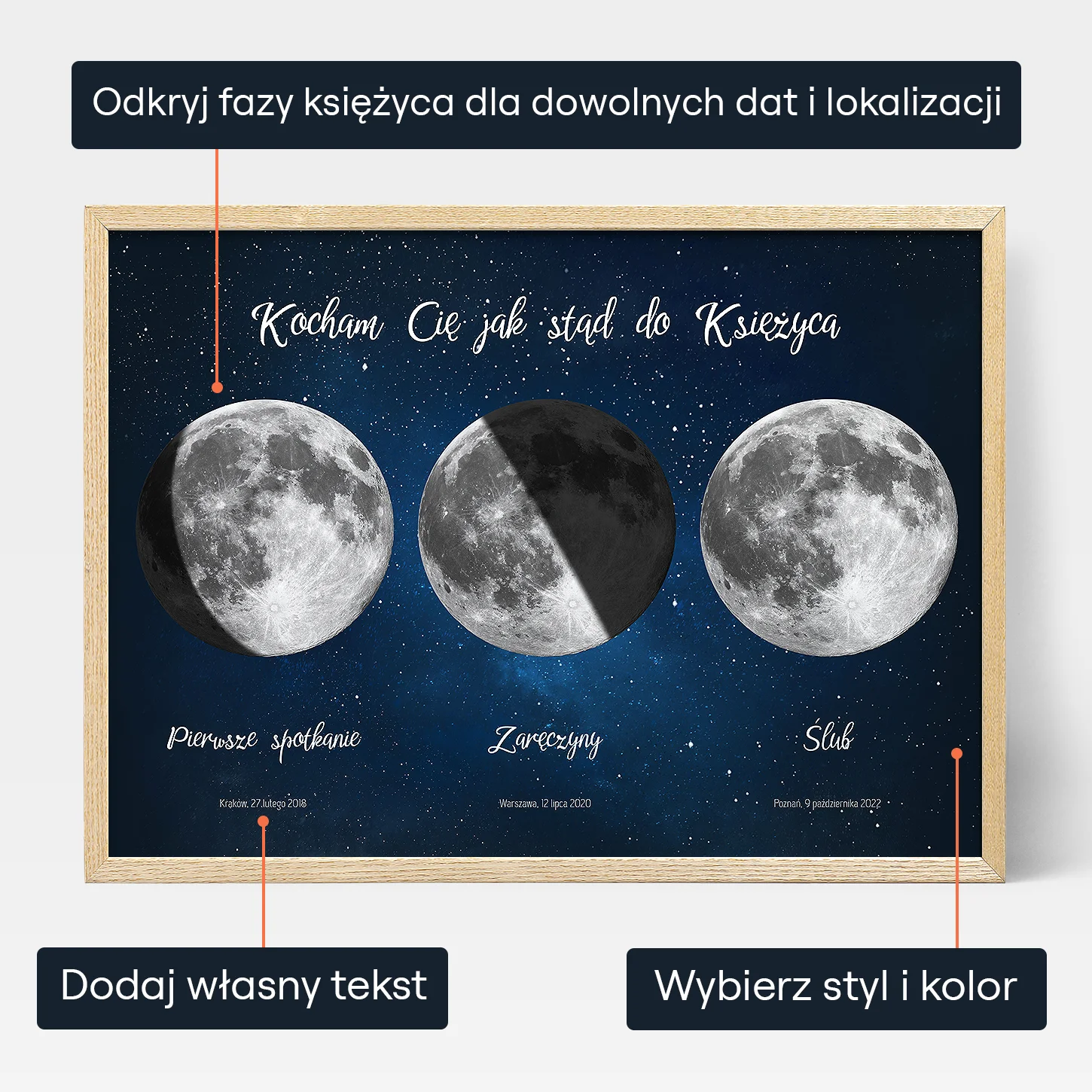 Aby rozpocząć personalizację projektu, wystarczy przejść do naszego kreatora online. Wybierz kolor tła z naszych gotowych opcji lub baw się kolorami samodzielnie, aby znaleźć idealne połączenie. Następnie wprowadź miejsce i czas, aby zobaczyć, jak wyglądały księżyce w te wyjątkowe dni. Możesz także dodać krótką wiadomość powyżej i tekst poniżej każdego księżyca.