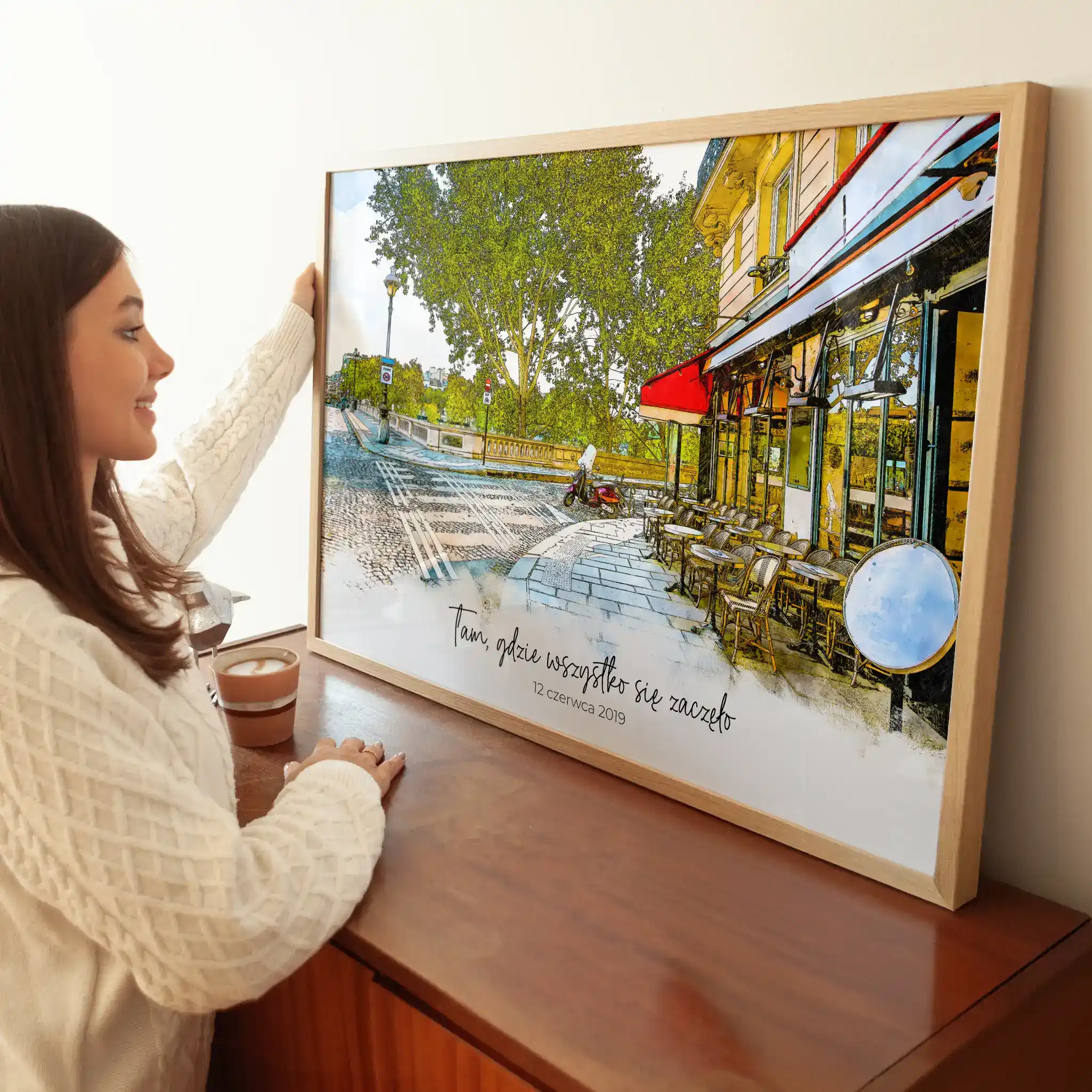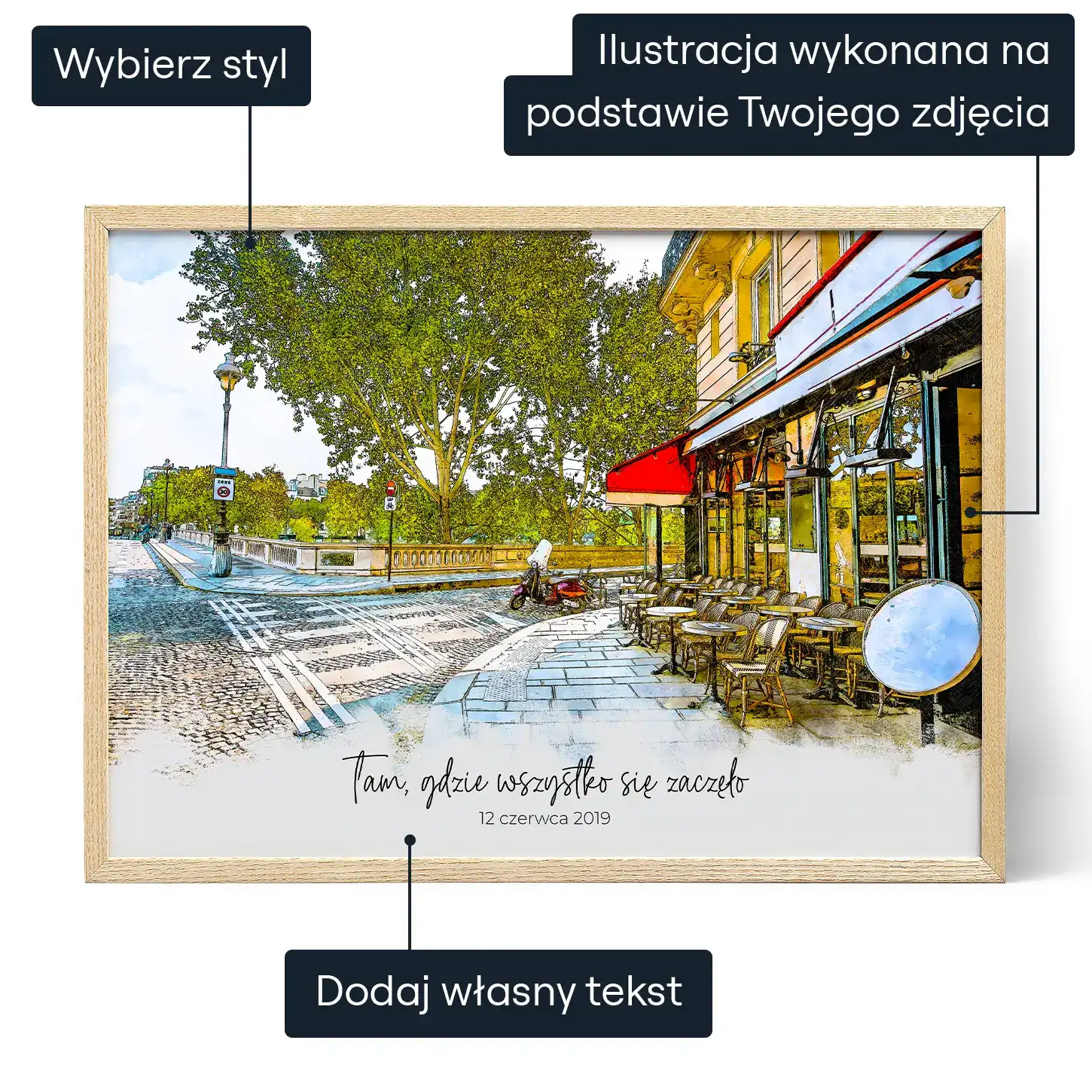Utrwal miejsce Waszego pierwszego spotkania na akwarelowej ilustracji - spersonalizowanej pamiątce pełnej wzruszeń.