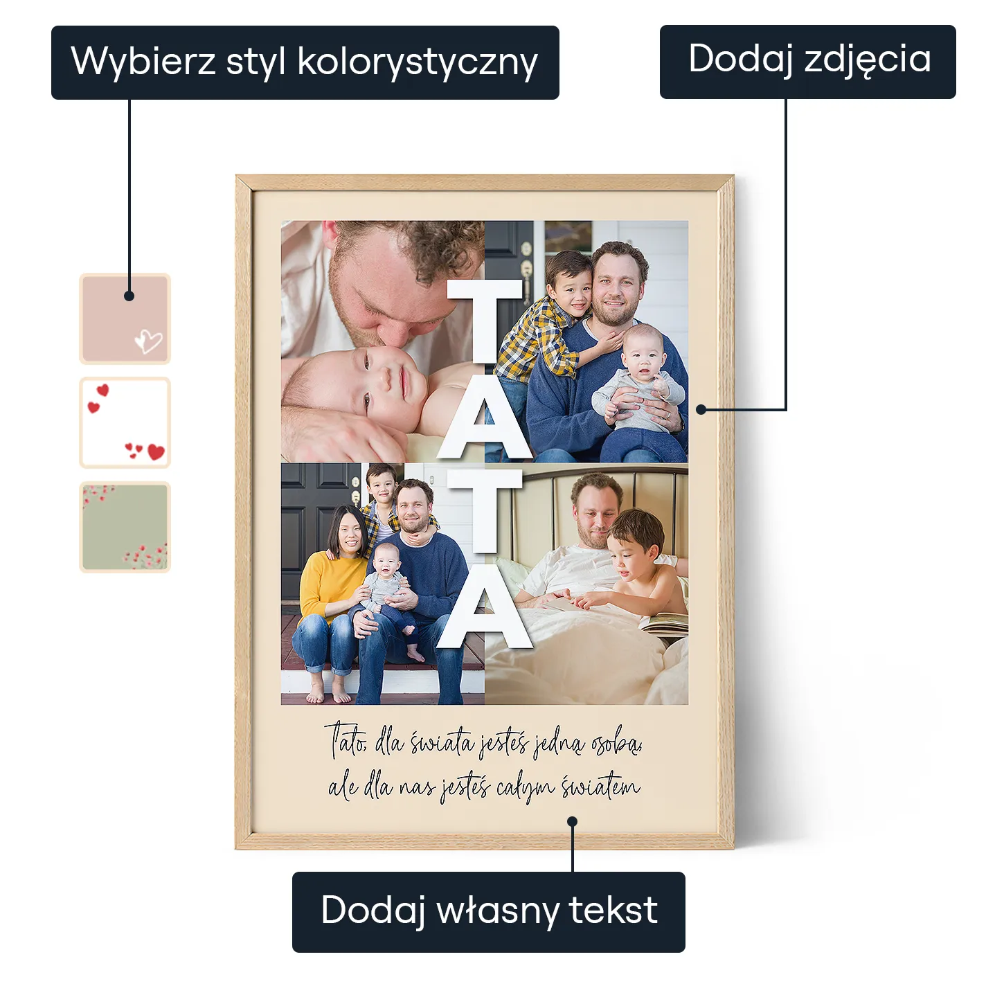Oferujemy bezpłatną personalizację dla wszystkich zamówień, zapewniając, że każde dzieło sztuki jest unikalnie dostosowane do preferencji naszych klientów. Nasz przyjazny dla użytkownika interfejs umożliwia łatwe tworzenie własnych, personalizowanych dzieł sztuki. Niezależnie od tego, czy korzystasz z komputera stacjonarnego, czy urządzenia mobilnego, nasz interfejs został zaprojektowany z myślą o intuicyjnym doświadczeniu.