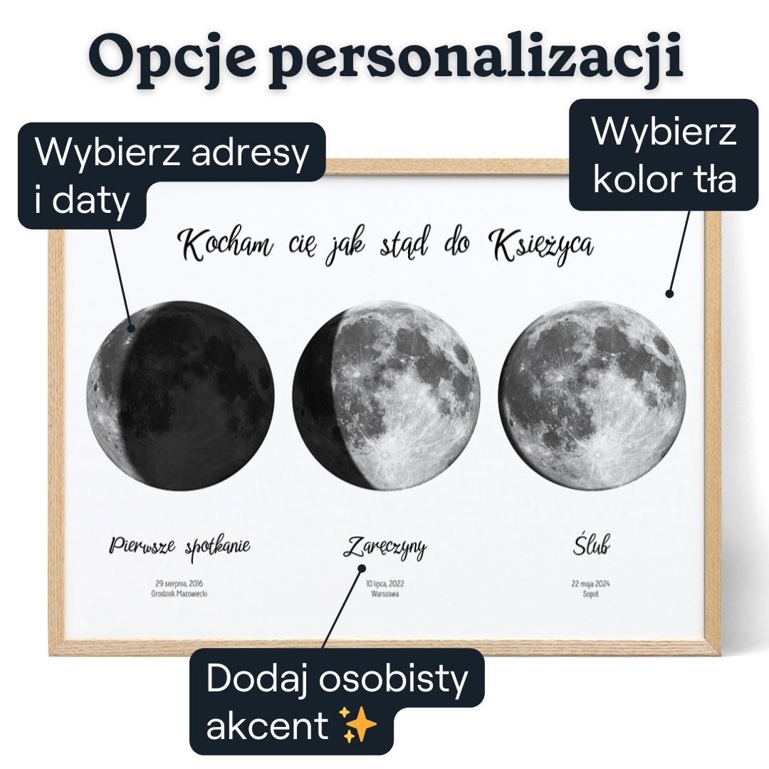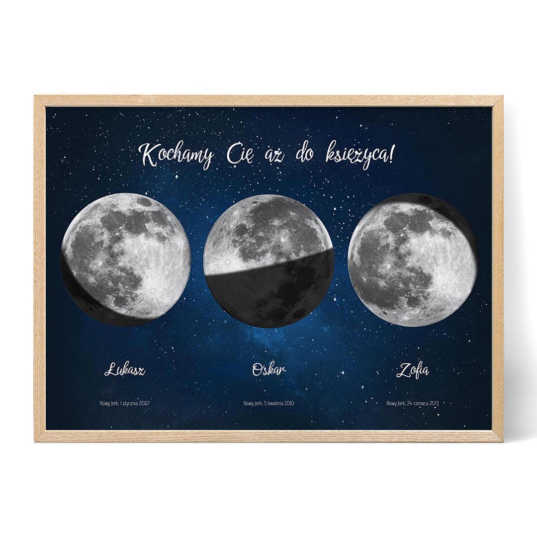 Po ustawieniu tytułu wprowadź daty i lokalizacje, aby wyświetlić fazy księżyca od dat urodzenia każdego dziecka. Poniżej każdej fazy księżyca możesz dodać imiona, daty urodzenia lub inny tekst, który sprawi, że będzie on jeszcze bardziej indywidualny. Na koniec wybierz format grafiki. Oferujemy różne rozmiary i style, w tym drukowane lub oprawione plakaty, obrazy na płótnie i pliki cyfrowe do natychmiastowego pobrania.