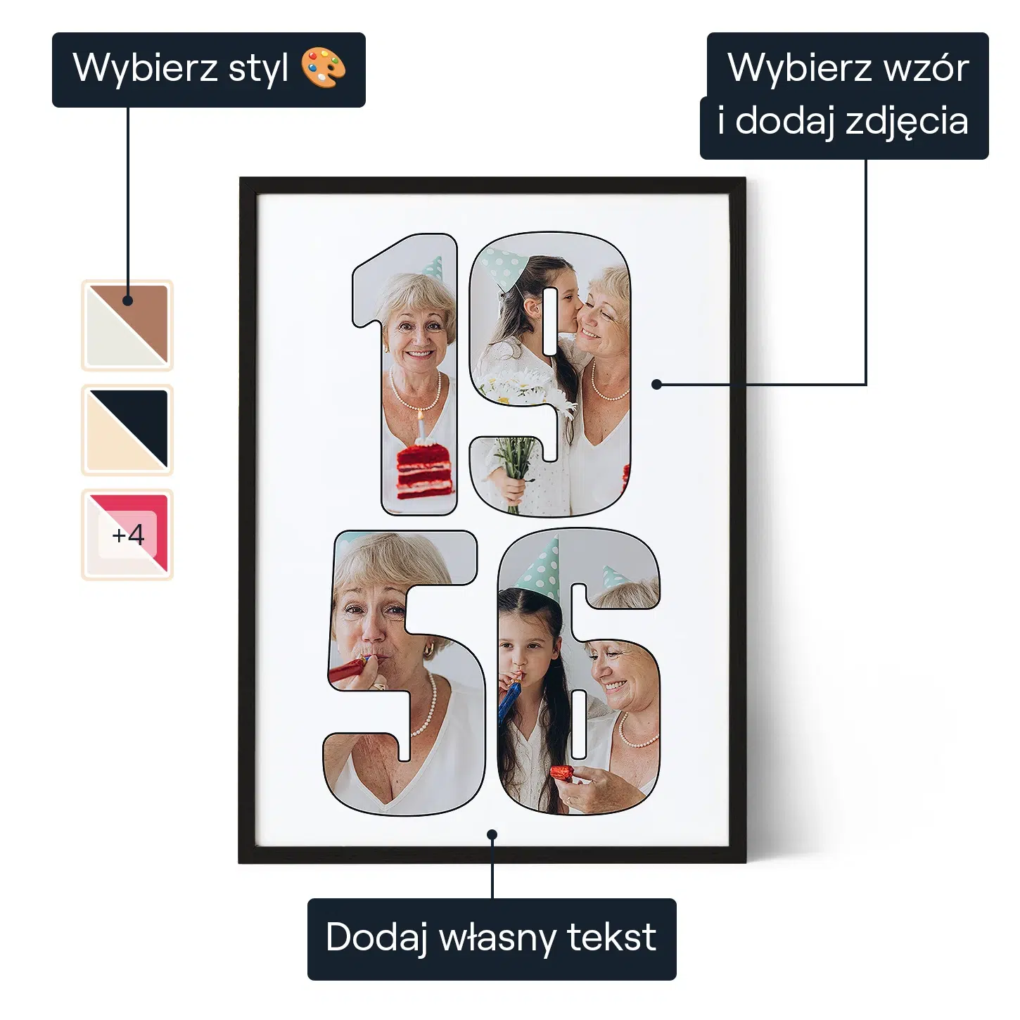 Zamień zdjęcia w spersonalizowany kolaż w kształcie roku urodzenia - wyjątkową pamiątkę, która pięknie podkreśla znaczenie tego roku