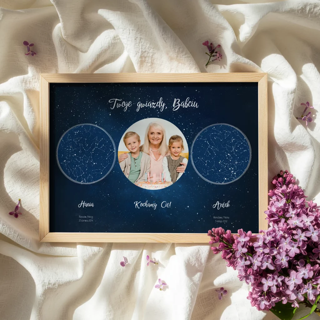 Mapy nieba pokazują układ gwiazd w chwili narodzin każdego z wnucząt. To wyjątkowy prezent dla Babci