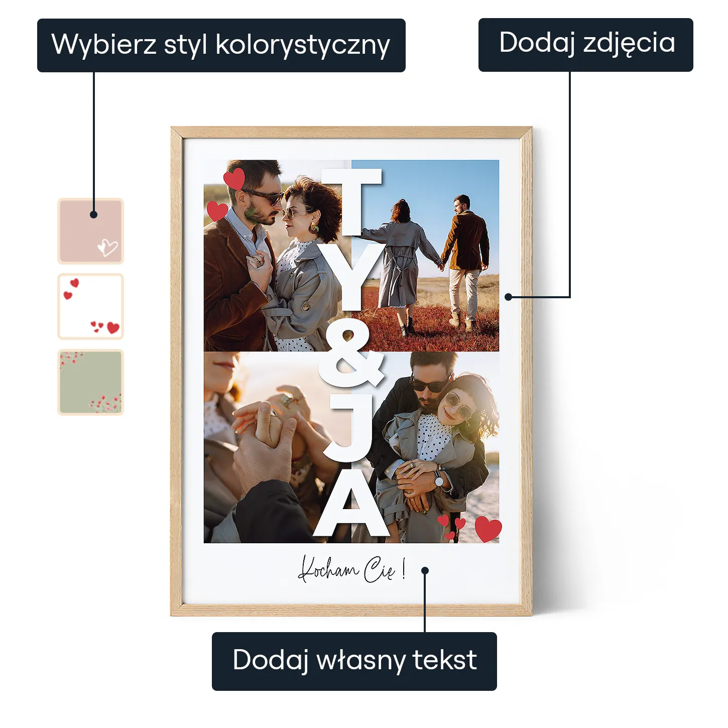 Oferujemy bezpłatną personalizację dla wszystkich zamówień, zapewniając, że każde dzieło sztuki jest unikalnie dostosowane do preferencji naszych klientów. Nasz przyjazny dla użytkownika interfejs umożliwia łatwe tworzenie własnych, personalizowanych dzieł sztuki. Niezależnie od tego, czy korzystasz z komputera stacjonarnego, czy urządzenia mobilnego, nasz interfejs został zaprojektowany z myślą o intuicyjnym doświadczeniu.