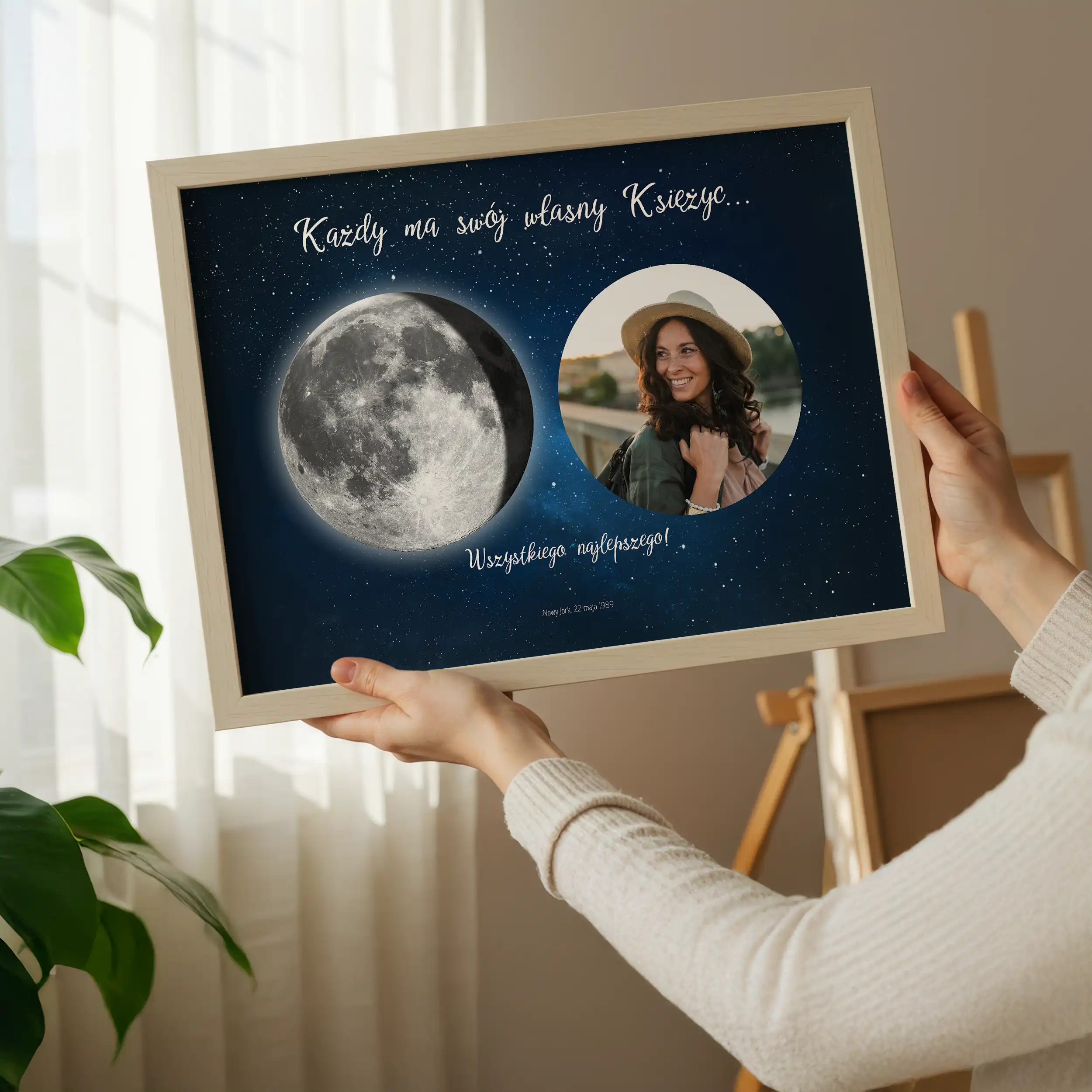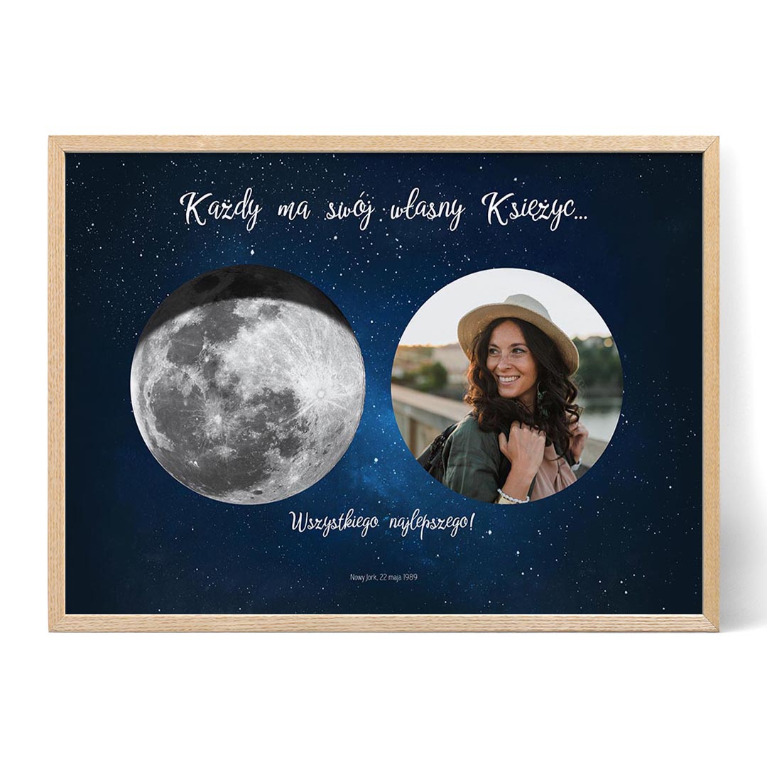 Szukasz wyjątkowego i wzruszającego prezentu z okazji specjalnych urodzin? Urodzinowy Księżyc ze Zdjęciem to personalizowany wydruk lub płótno, które pięknie oddaje cudowną fazę księżyca z dnia, w którym ktoś się urodził, wraz z cennym zdjęciem. Ta wyjątkowa grafika to idealny sposób na upamiętnienie urodzin i stworzenie trwałej pamiątki, która będzie ceniona na zawsze.