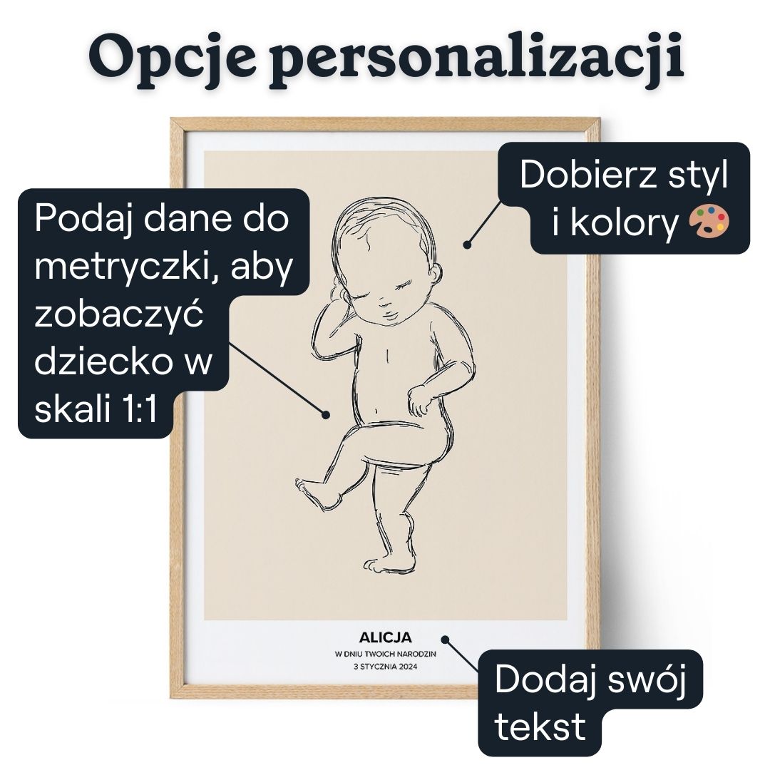 Dzięki naszemu edytorowi możesz dostosować wiele szczegółów, aby stworzyć idealną metryczkę dla dziecka. Możesz podać wzrost i wagę dziecka oraz datę urodzenia. Możesz także wybrać kolor tła, który pasuje do Twojego stylu, i wybierać spośród różnych projektów szkiców dzieci. Niezależnie od tego, czy szukasz czegoś minimalistycznego, czy bardziej kolorowego, znajdziesz coś dla siebie i swojej rodziny.