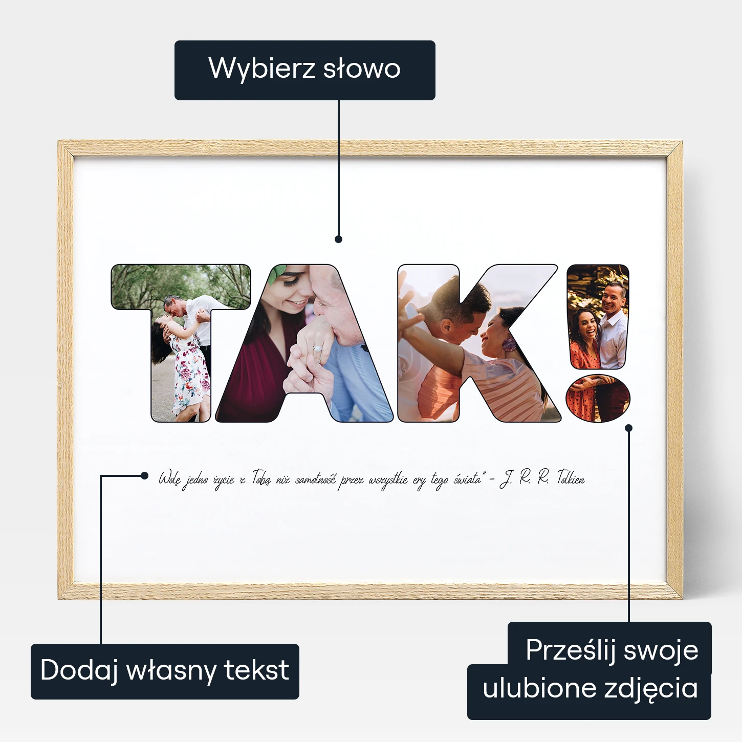 Kolaż zdjęć w formie napisu to wyjątkowy prezent na zaręczyny. To jedyny w swoim rodzaju wydruk, w którym wszystko można spersonalizować! To kolaż zdjęć, w którym możesz wybrać dowolne krótkie słowo. Może to być data zaręczyn lub słowa takie jak „tak!”, „zaręczeni” lub „kocham cię”. To Ty możesz zdecydować!