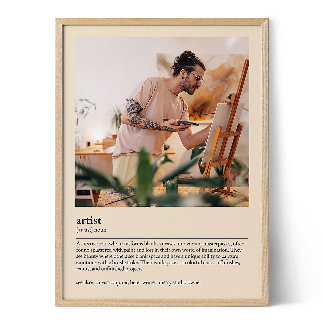 Looking for a unique and fun gift for the artist in your life? Our Artist Definition Poster is the perfect choice. This personalized print features your own photo and a dictionary definition of the word "artist," making it a memorable and thoughtful gift.
