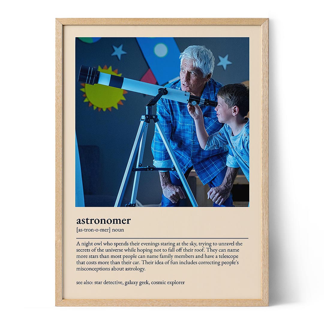 Looking for a stellar gift for the amateur astronomer in your life? Our Astronomer Definition Poster is the perfect choice. This personalized print combines your own photo with a dictionary definition of the word "astronomer," creating a humorous and thoughtful gift.