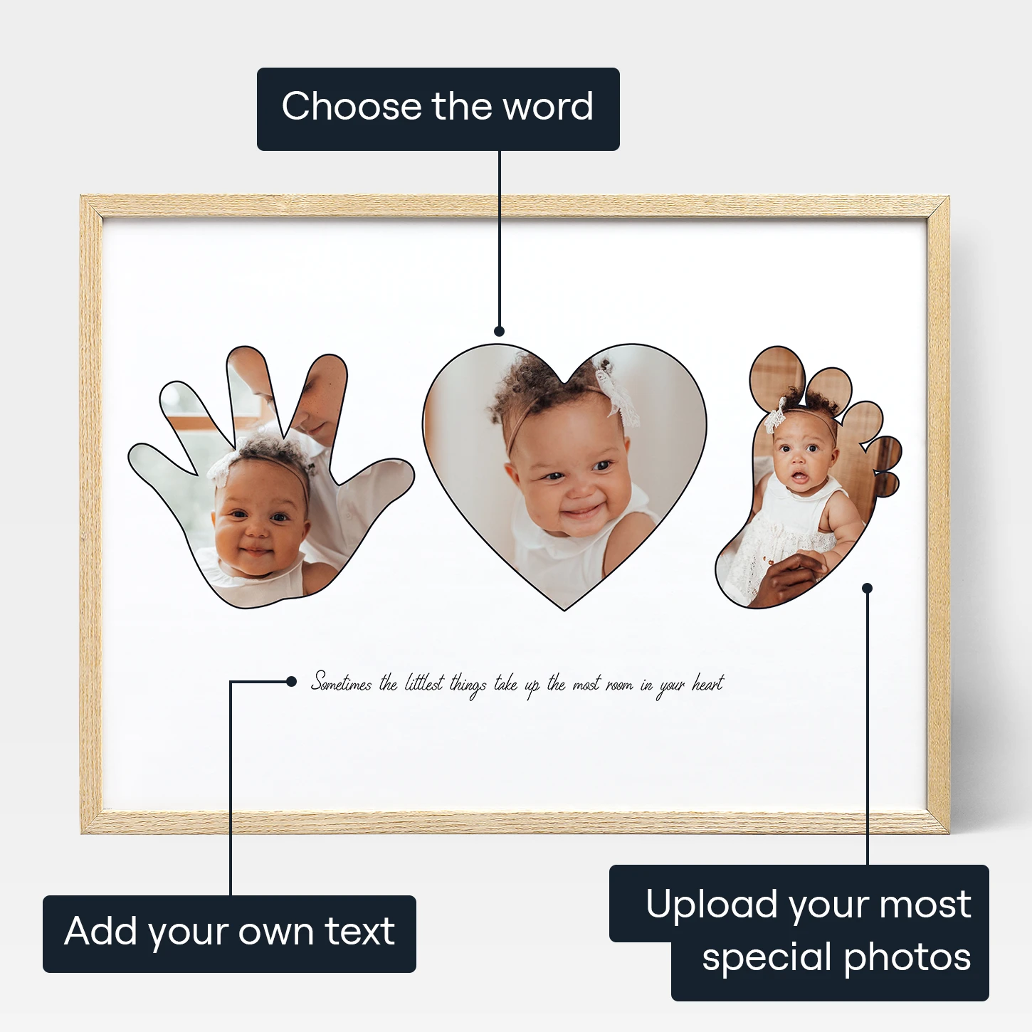 Baby Photo Collage is a fantastic way to preserve your precious memories and create a unique and personalized print or canvas. With this special collage, you can shape your photos into various symbols, such as stars, footprints, hearts, or hands. Additionally, you have the option to use numbers or letters to make it even more meaningful. This extraordinary creation is not only a perfect gift for a baby's birthday, but it also serves as a wonderful decoration for any child's room.