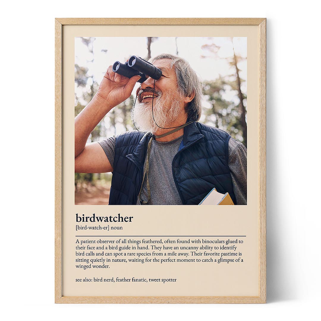 Looking for a whimsical and heartfelt gift for the birdwatcher in your life? Our Birdwatcher Definition Poster is the perfect choice. This personalized print combines a dictionary-style definition of "birdwatcher" with your own photo, creating a unique and meaningful piece of art.