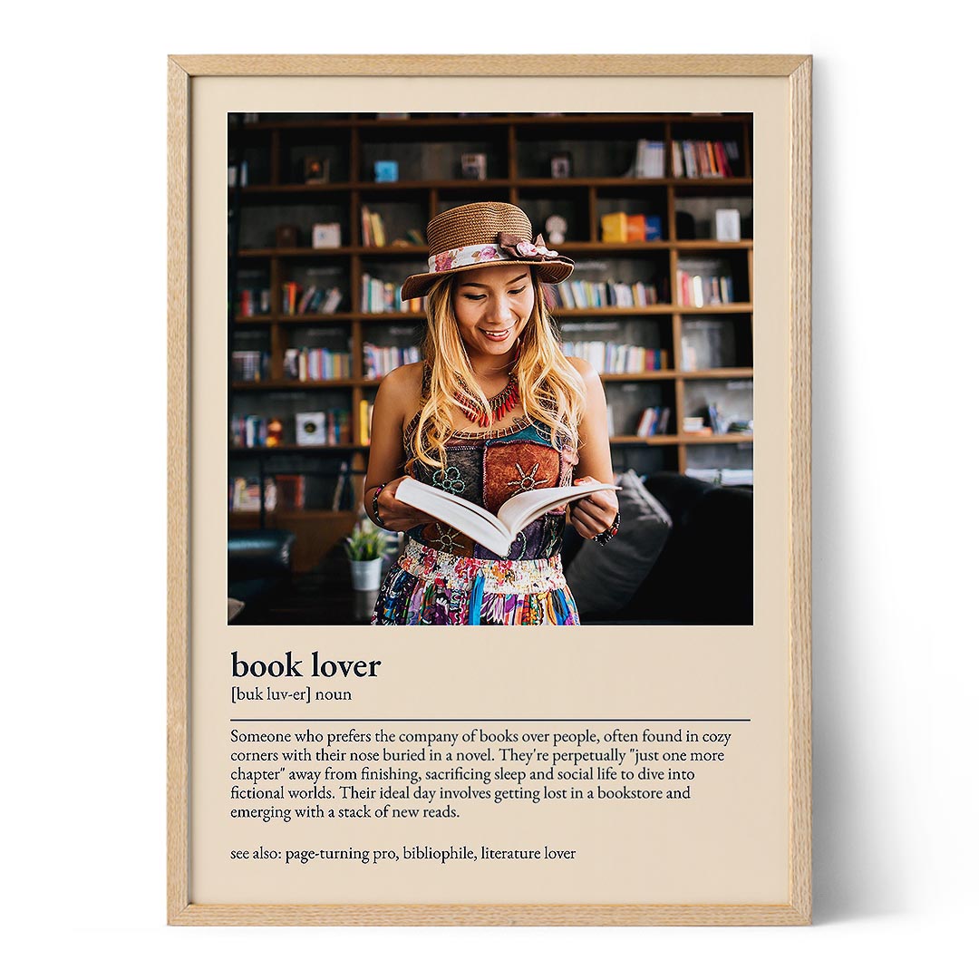 Looking for a delightful and personalized gift for book lovers? Introducing our Book Lover Definition Poster, a charming print that combines your chosen photo with a whimsical dictionary-style definition of "book lover," highlighting their passion for literature in a humorous way.