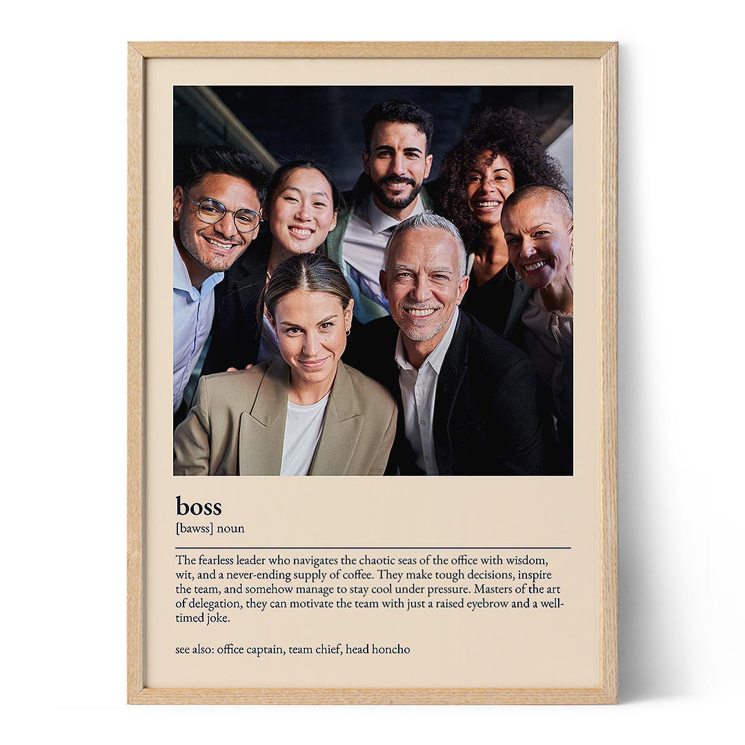 Looking for a unique and fun gift for your boss? Our Boss Definition Poster is the perfect choice. This personalized print features your own photo and a dictionary definition of the word "boss," making it a memorable and thoughtful gift.