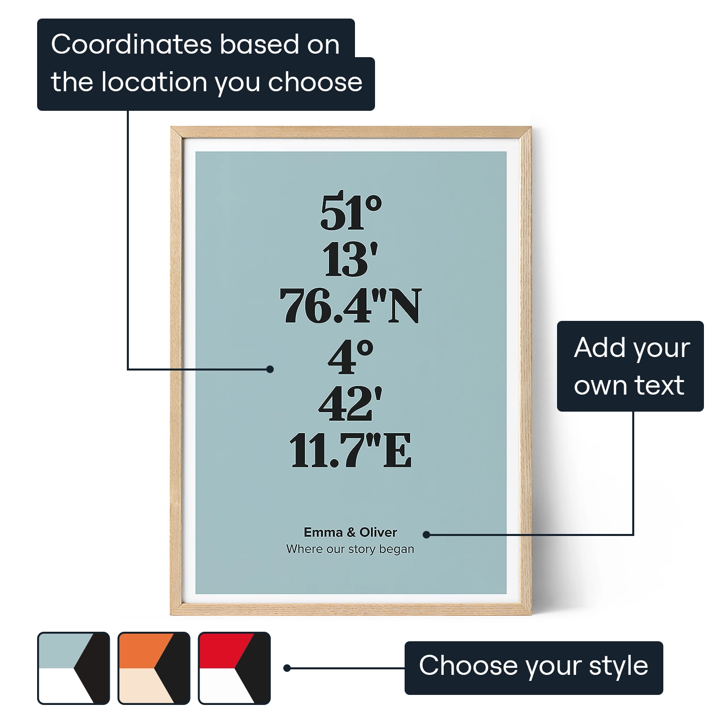We’ll find the coordinates to your wedding venue, your first home, your first job, your university, your childhood home, or anywhere that holds special meaning for you. Turn your coordinates into wall art to capture your most precious moments and turn them into memories that will last a lifetime.