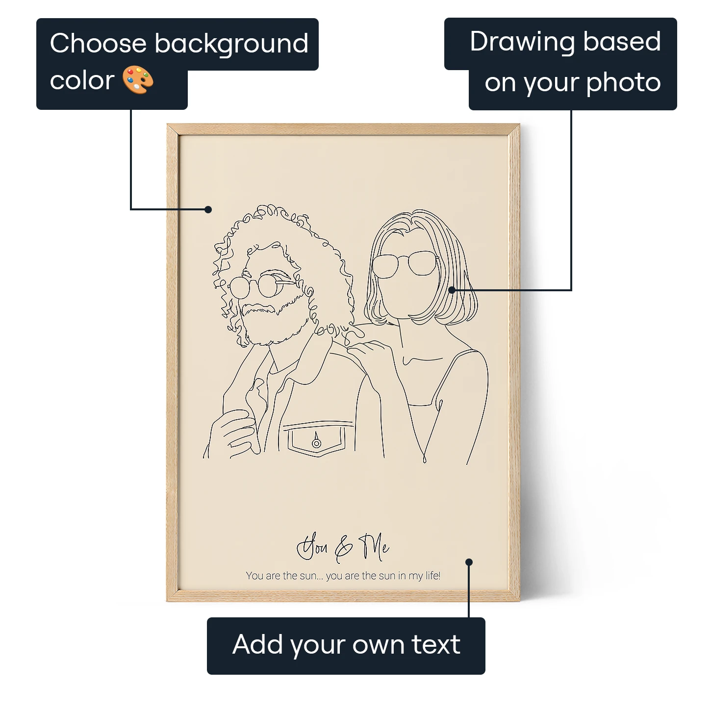 Celebrate the unique bond between you and your partner with our enchanting You & Me Line Art. Turn a cherished photo into a timeless piece of personalized artwork that captures the essence of your love story. Our skilled artists will delicately hand-draw every detail, creating a unique representation that mirrors the romance and connection between you two. Choose your preferred style and colors, upload your special couple photo, and add a personal touch with a heartfelt message. Create a meaningful keepsake that symbolizes the love and companionship you share.