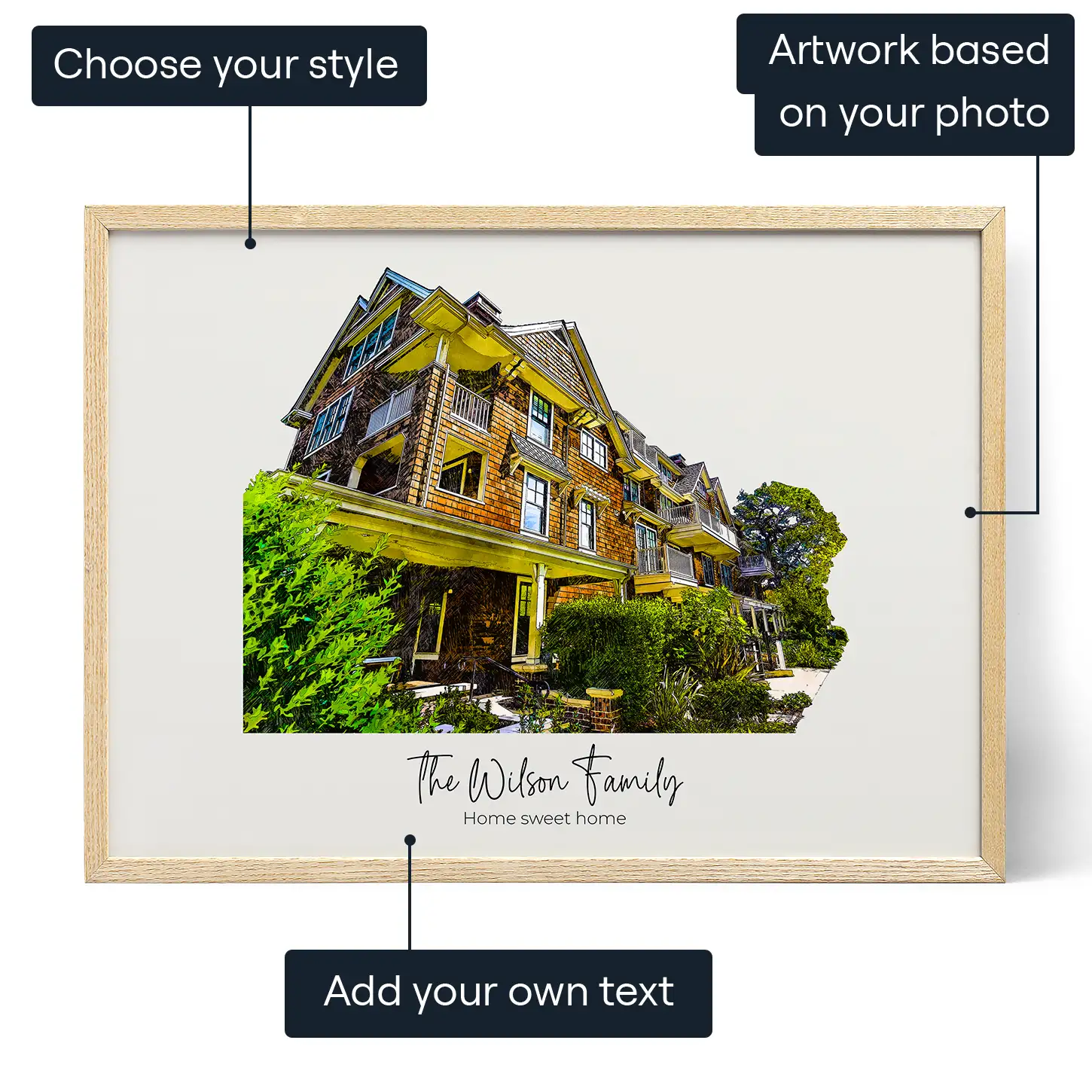 Transform your home’s photo into a personalized digital portrait, complete with custom text, creating the perfect milestone memento, whether it’s your first house or your forever home.