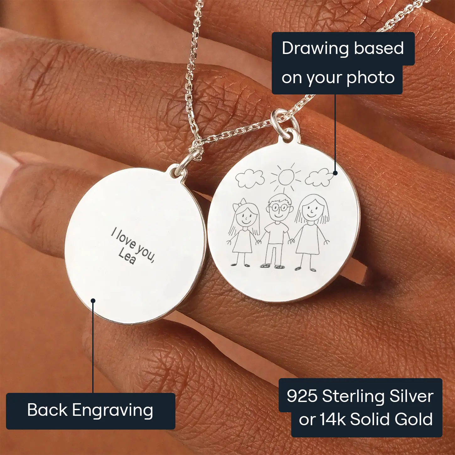 Using our user-friendly online editor, you can easily upload a photo of your child’s drawing and add a custom message to the back of the pendant. Each pendant, whether a sleek circle or paired with a 45 cm chain, undergoes meticulous laser engraving to ensure perfect detail and durability.
