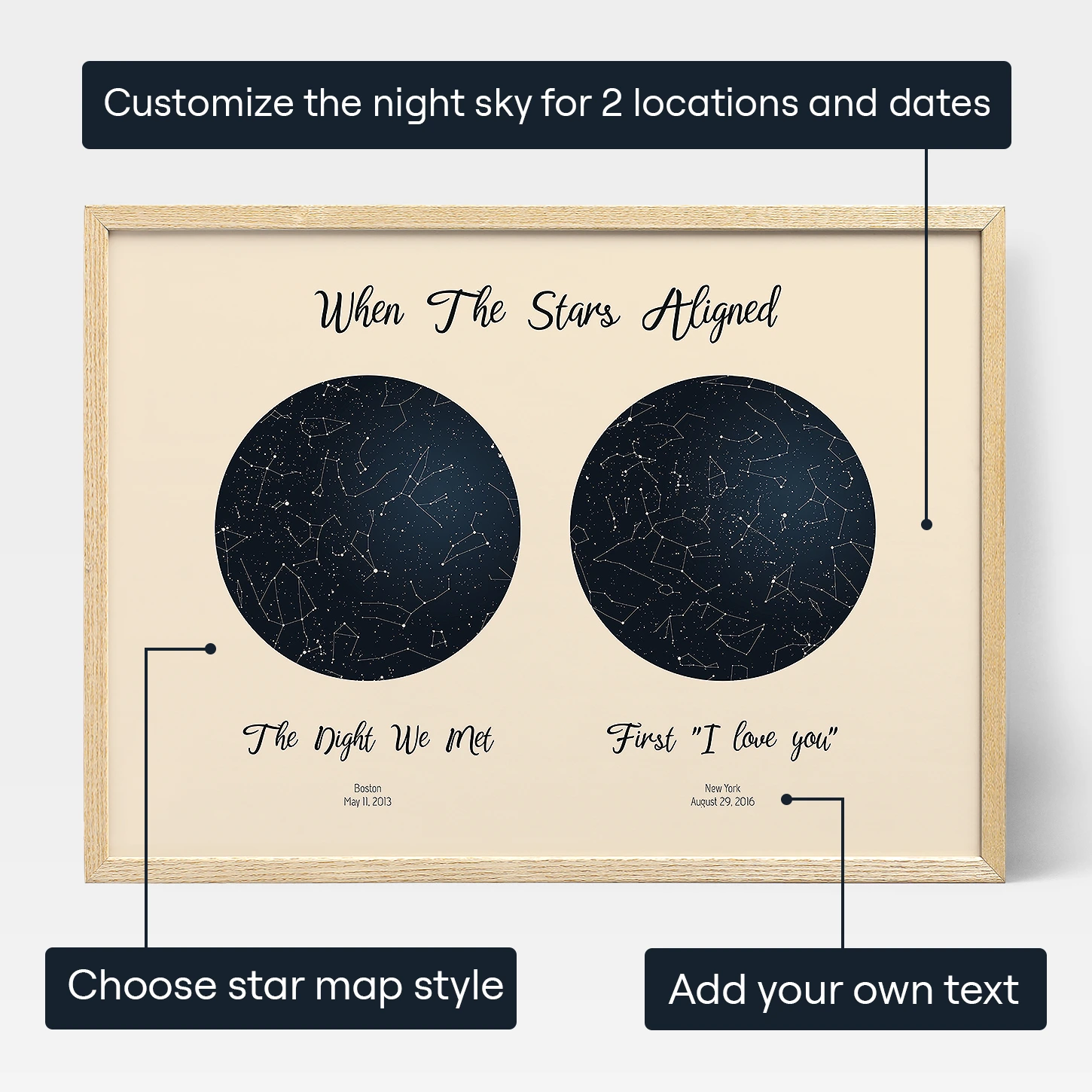 Are you looking for a unique and meaningful gift for someone special? Look no further than Double Star Map! Our star maps capture two night skies from the dates and locations of your choice, creating a lasting keepsake that reflects special moments in your life.