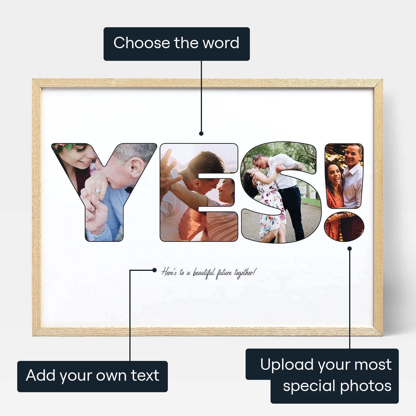 The Engagement Letter Photo Collage is a cool gift for engagements. It's a special picture print or canvas that's all about you! It's a collage made of pictures, where you can choose any short word you like. It could be your engagement date or words like "yes!", "engaged," or "love you." You get to decide!