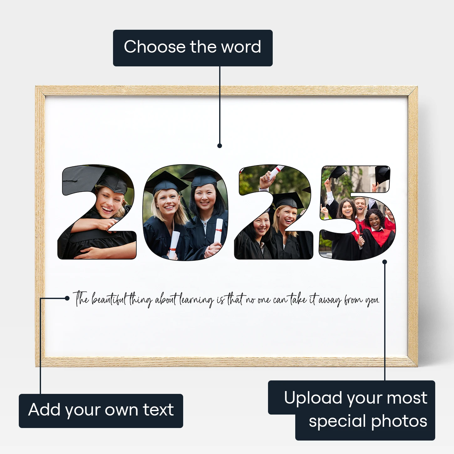 To start creating your Graduation Year Photo Collage, simply choose a word (or number) and upload photos. Our technology allows you to arrange the photos into the chosen number or word shape, ensuring that your collage is an accurate representation of your chosen design. You can then customize the print format, choosing from posters, canvas or framed prints, or digital download files for self-print.