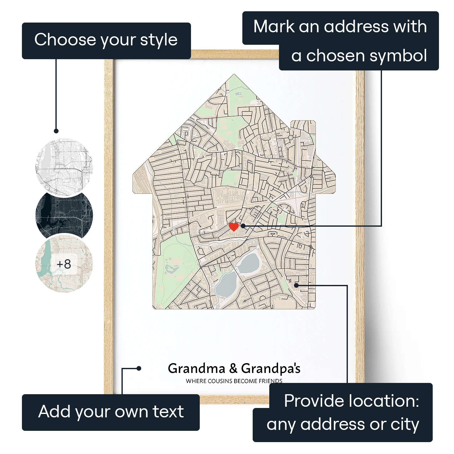 Grandma and Grandpa's house was always the place to be when we were a kid. From sleepovers to birthday parties, every event was more fun at their house. And now that we're grown up, it's still a special place to visit. That's why we've created this custom map art piece, which features their house as the centrepiece. It's the perfect way to show them how much we appreciate all the memories we've made there.