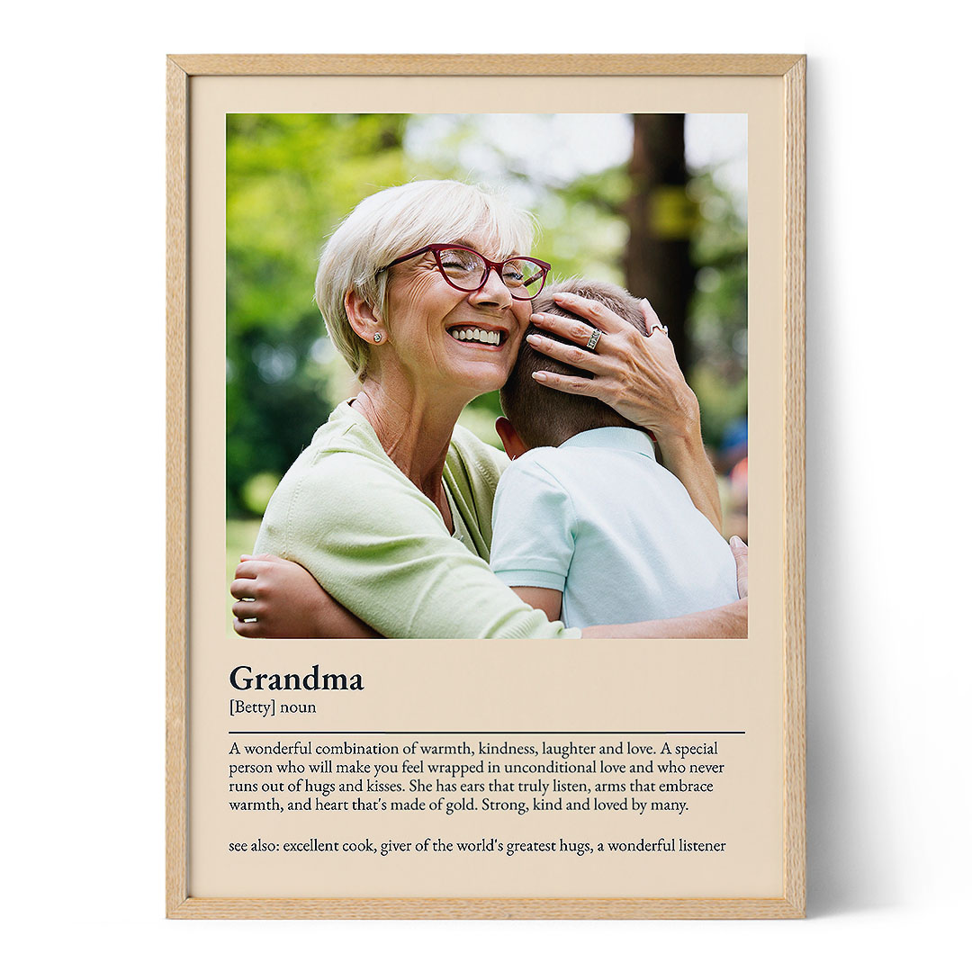 Capture the essence of your beloved grandma with our Grandma Definition Poster. This personalized print combines a cherished photo with a dictionary-style definition of "grandma" or any other word that represents her. Whether you choose a definition that's funny or deeply emotional, this gift is sure to touch her heart.
