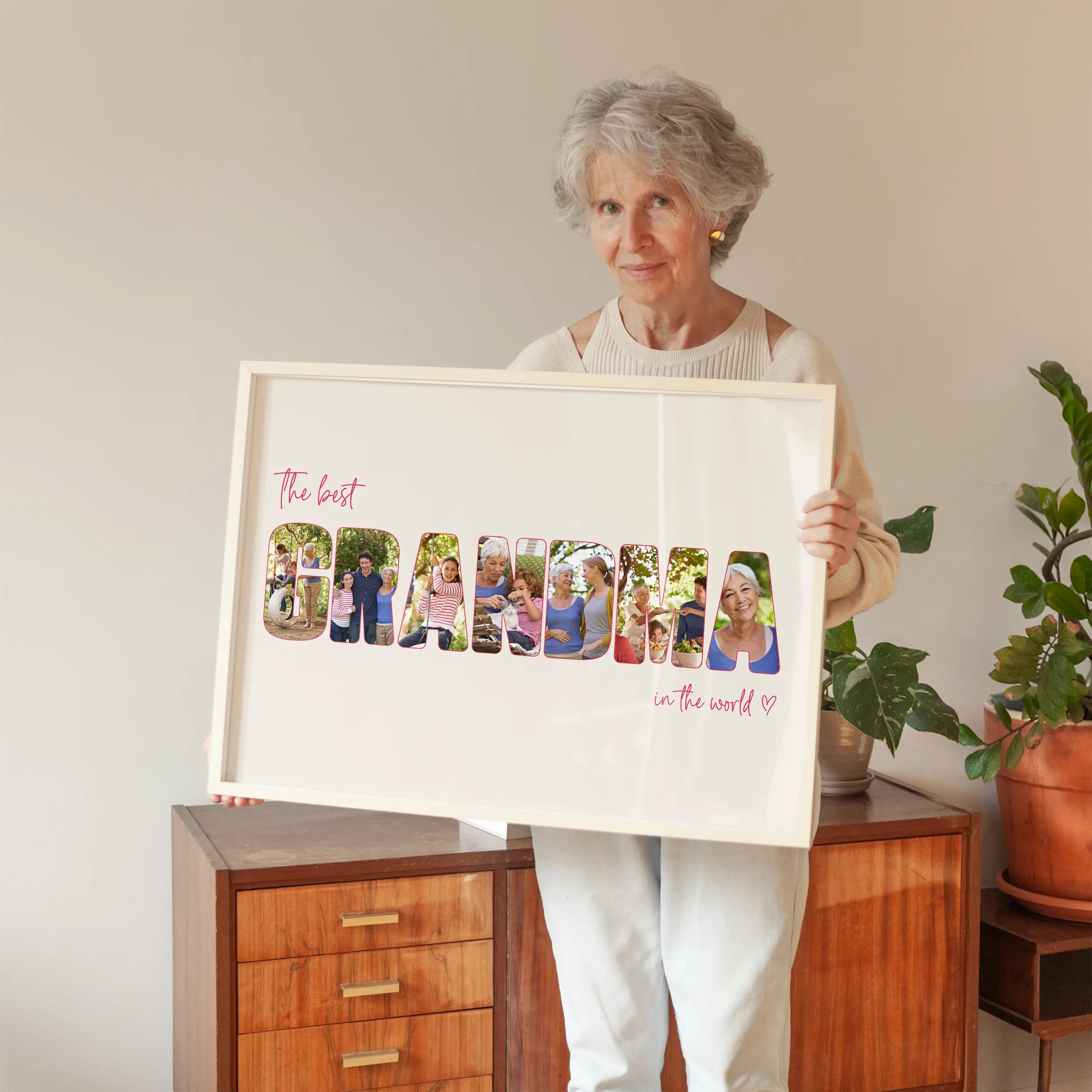 To create your own Grandma Letter Photo Collage, simply head to our online editor and upload your favorite photos. Each letter of the chosen word will be made out of your chosen photos, creating a unique, personalized, and heartfelt gift. You can choose from different print formats, including posters, canvas or framed prints, or digital download files for self-print.