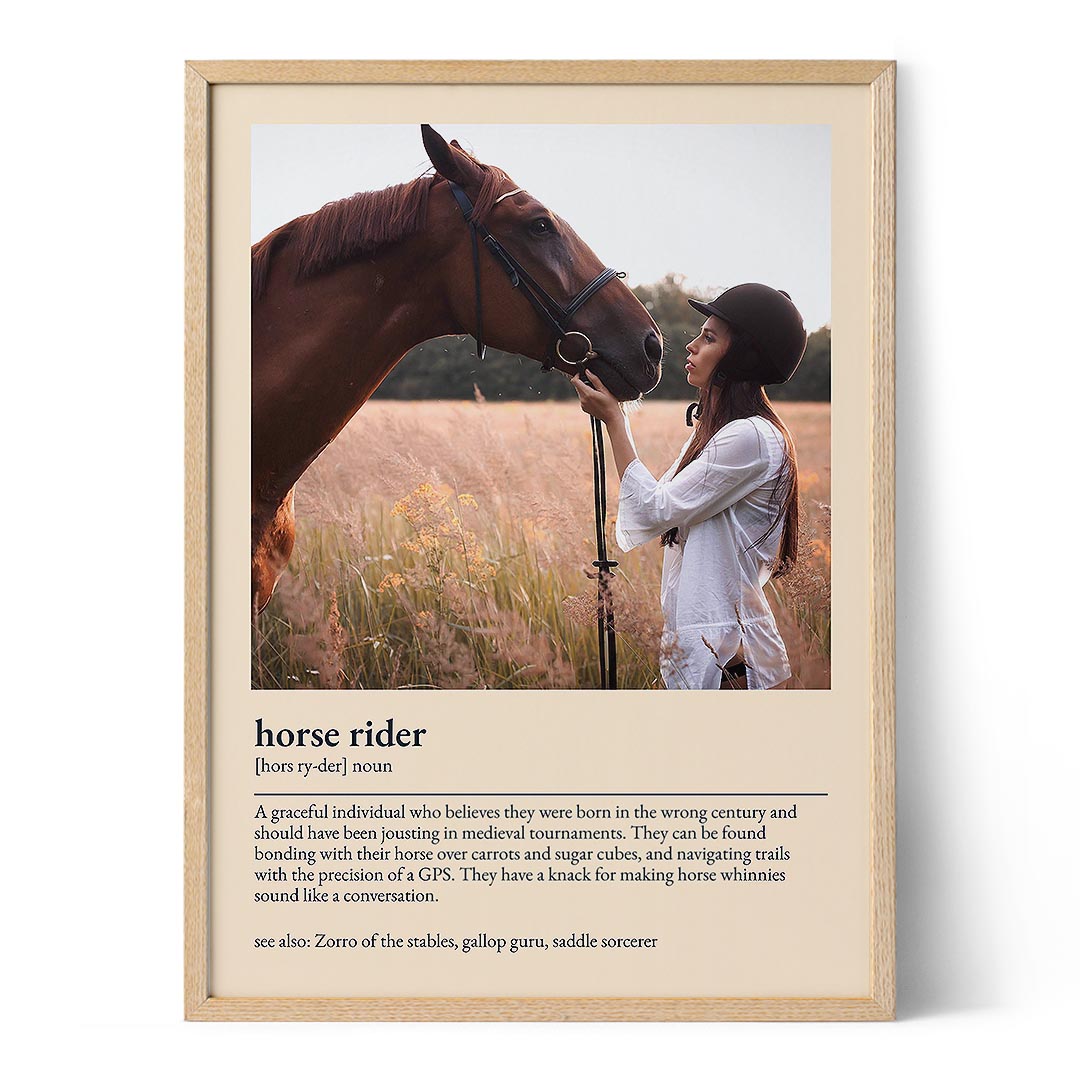 Looking for a unique and personalized gift for a passionate horse rider? Our Horse Rider Definition Poster is the perfect choice. This custom print features your own photo alongside a humorous dictionary-style definition of the term "horse rider," celebrating their love for horses in a fun and heartfelt way.