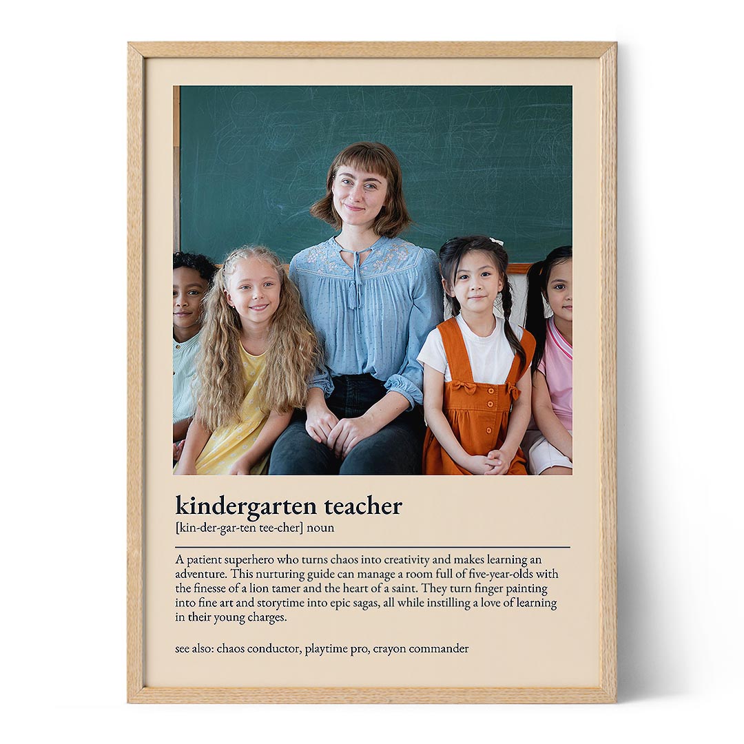 Looking to surprise a dedicated kindergarten teacher with a personalized and humorous gift? Our Kindergarten Teacher Definition Poster is designed just for them. This custom print features your chosen photo alongside a playful dictionary-style definition of the term "kindergarten teacher," capturing the essence of their unique role with humor and warmth.