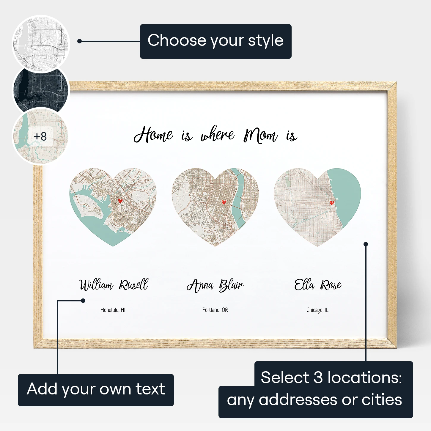 Home is where your mom is, and this beautiful custom Long Distance Mom Map helps you keep her close to your heart. This triple map format lets you customize three small maps within the same print — and the possibilities are endless!