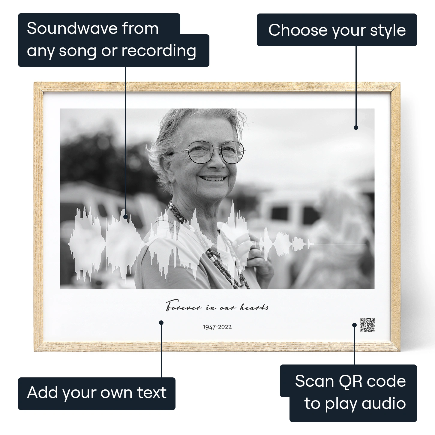 We turn audio recordings into visual works of art that you can also replay for years to come. Just scan the QR code with your smart device and hear their sweet words once more. When your heart starts yearning to be close to them again, their voice is just a piece of artwork away.