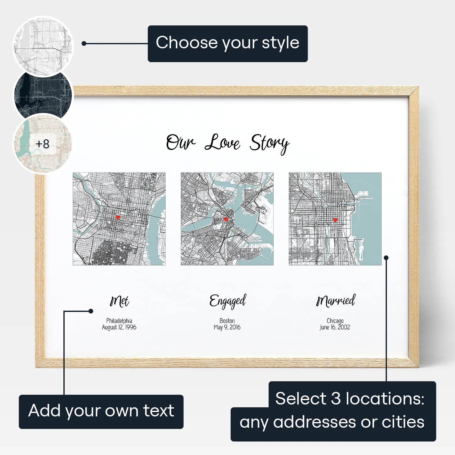 Celebrate 3 relationship milestones with a personalized map, a unique and sentimental keepsake to cherish