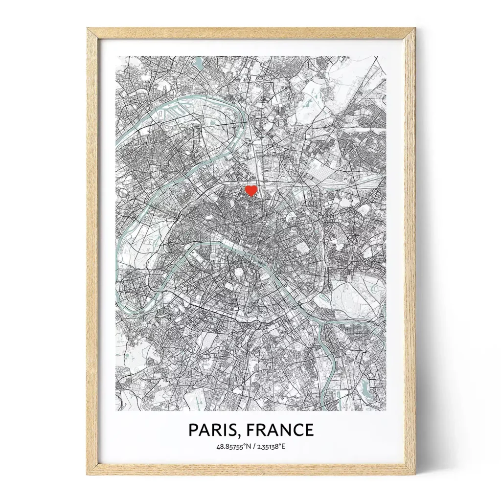 Ever wondered how you could turn your wanderlust into beautiful, personalized decor? Our Paris map art is here to help you do just that! Each map tells a unique story, reflecting the adventures and memories that have shaped your life. Hang it proudly on your wall and let it spark conversations with every visitor who enters your home. Whether you're reliving past travels or dreaming of new ones, our Paris map art is sure to inspire your next adventure. So why not start your journey today and create your very own Paris map poster? Are you ready to unleash your inner map artist? With our easy-to-use custom Paris map print maker, you can do just that in a matter of minutes! Simply input your details, follow the steps, and voila – your personalized map will be on its way to you. Plus, with the option to download a digital print, you can get started on your wall art even sooner. So don't wait any longer – let your Paris poster inspire your travels, past, present, and future!