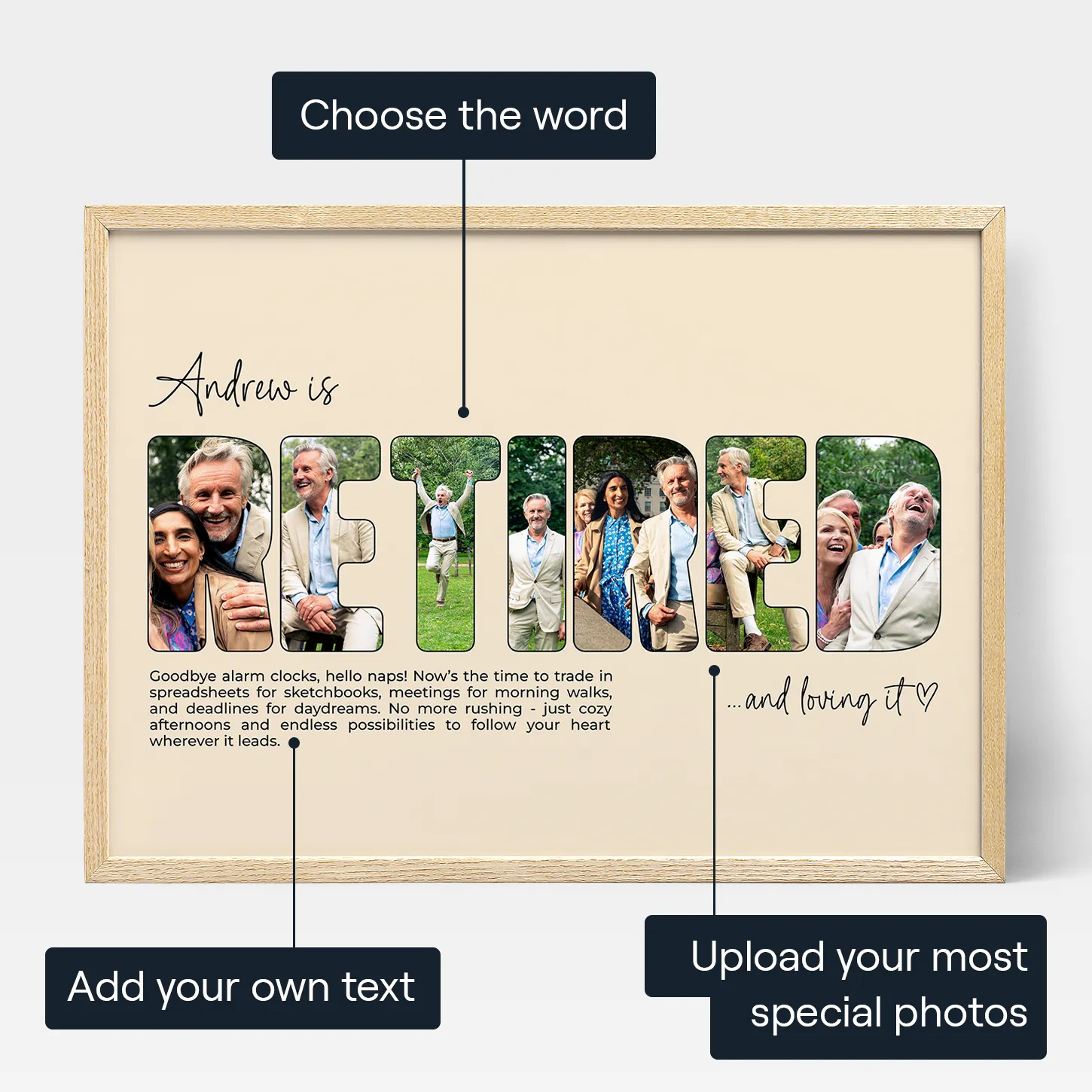 The Retired Letter Photo Collage is a special gift. It's not like the usual presents. It's a collection of memories shaped like the word "retired" or your chosen message. Our online editor is easy to use. You can pick colors for each letter, add text, and place pictures that tell the retiree's story. You control how close or far the photos are and where they go. This makes a beautiful and touching gift. This custom collage isn't just any retirement gift. It's a way to say thank you for years of dedication. Whether it's for a coworker, a team member, or a workplace legend, it captures their journey and the bonds made along the way. It's a special way to show gratitude, remember good times, and honor their legacy. With great care and attention, we turn memories into a real symbol of thanks and friendship. It's the perfect choice for marking a retirement milestone.Retired Letter Photo Collage: Emotionally Meaningful