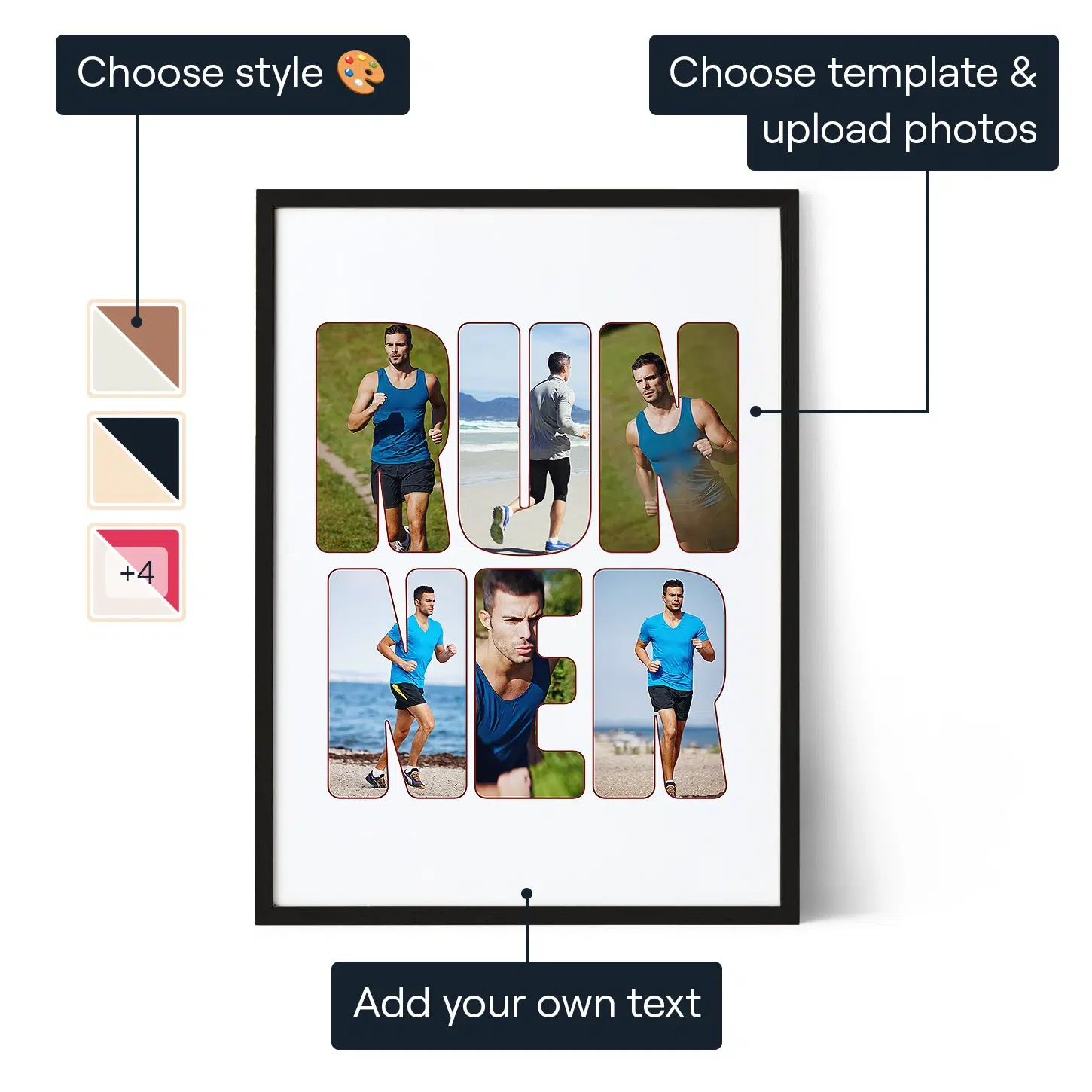 Turn photos of races, training, and memorable running moments into a personalized collage that celebrates a runner’s journey and achievements