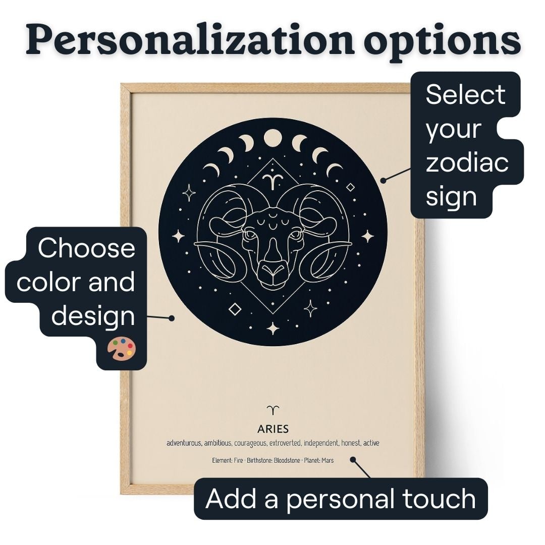 Creating your very own poster is super simple. Go to our online editor, pick your favorite layout and style, choose the details you like, and select Scorpio as the zodiac sign. You can choose a printed poster, framed art, canvas, or instant digital download – whatever you decide, you'll have a stunning creation that adds cosmic beauty to your space.
