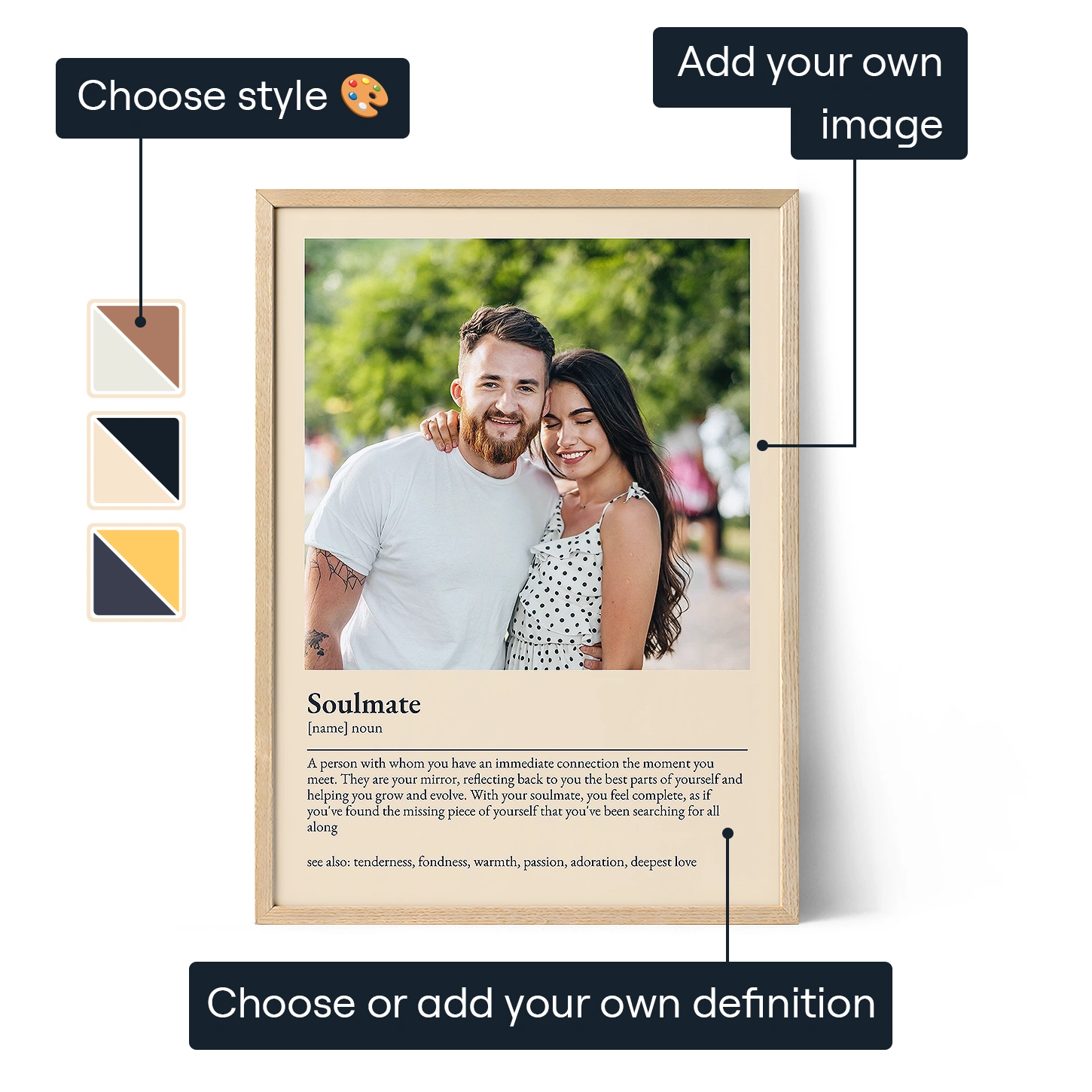 With our Soulmate Definition Poster, you can define your connection in a way that's deeply meaningful to you. Customize your poster by choosing from our predefined definition or crafting your own, whether it's funny, emotional, or deeply personal.